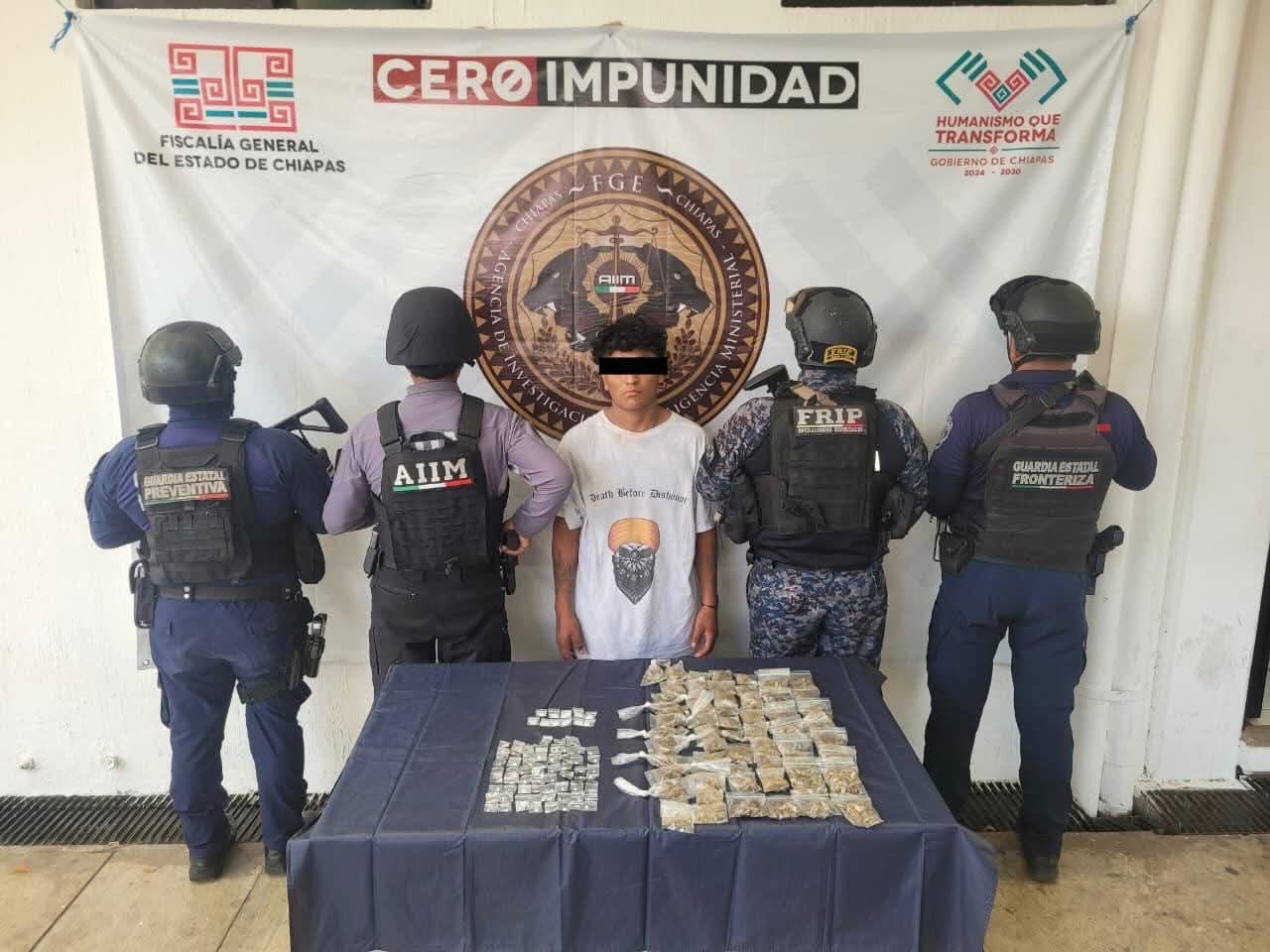 Tapachula, Chiapas.– En un operativo coordinado de fuerzas estatales, un hombre fue detenido en posesión de diversas drogas en la zona sur-oriente de la ciudad, quien además aseguró pertenecer al denominado Cártel Chiapas y Guatemala, lo que encendió las alertas de las corporaciones de seguridad en la región.