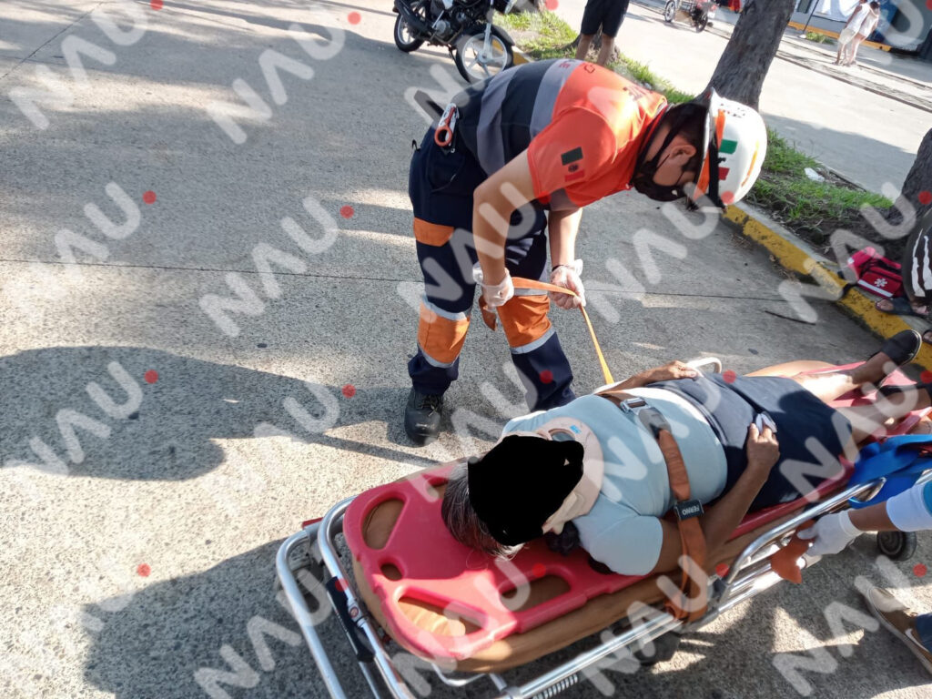 Paramédicos del Grupo SAE, a bordo de la unidad UR-01, acudieron de inmediato al sitio y localizaron a la lesionada tendida sobre el pavimento, en posición supina, con visibles muestras de dolor. Tras la valoración inicial, determinaron que presentaba dolor intenso en la zona cervical y la columna, por lo que procedieron a inmovilizarla cuidadosamente antes de su traslado.