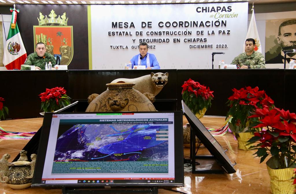 • Informó que el frente frío 13 se encuentra estacionado en Chiapas, por lo tanto, seguirán las lluvias, bajas temperaturas y vientos; pidió extremar precauciones