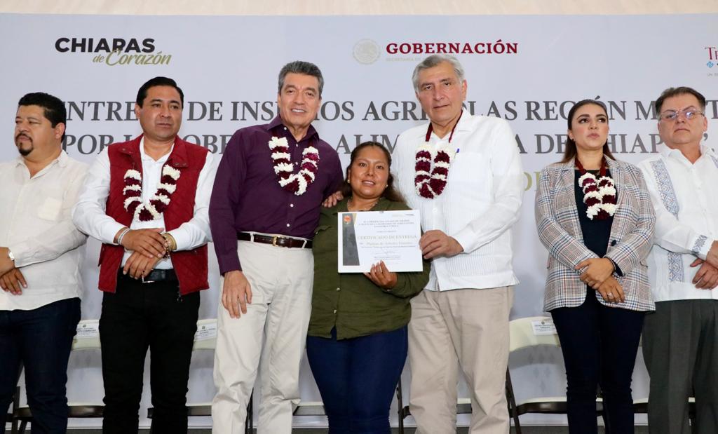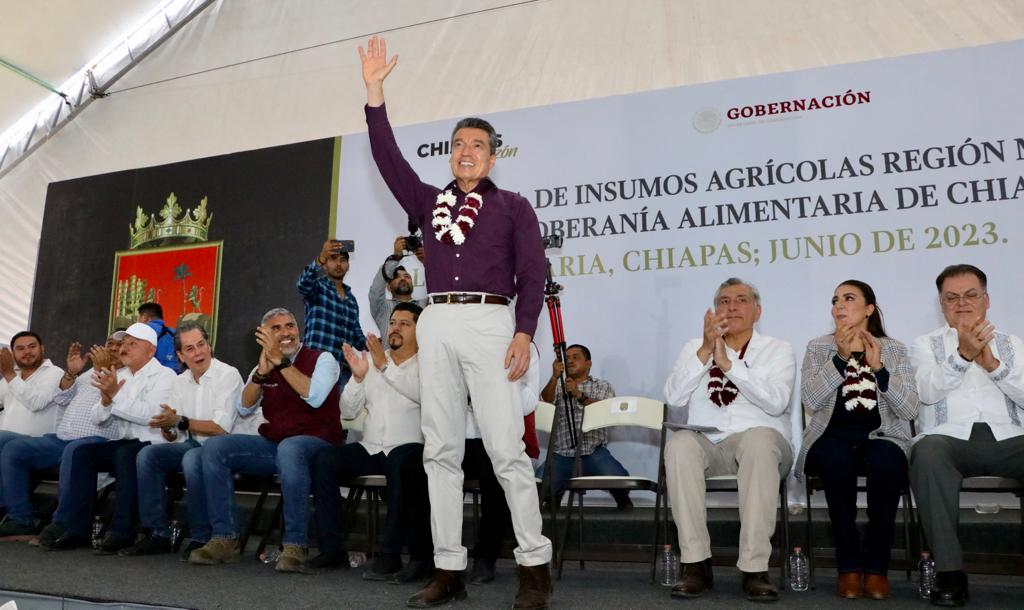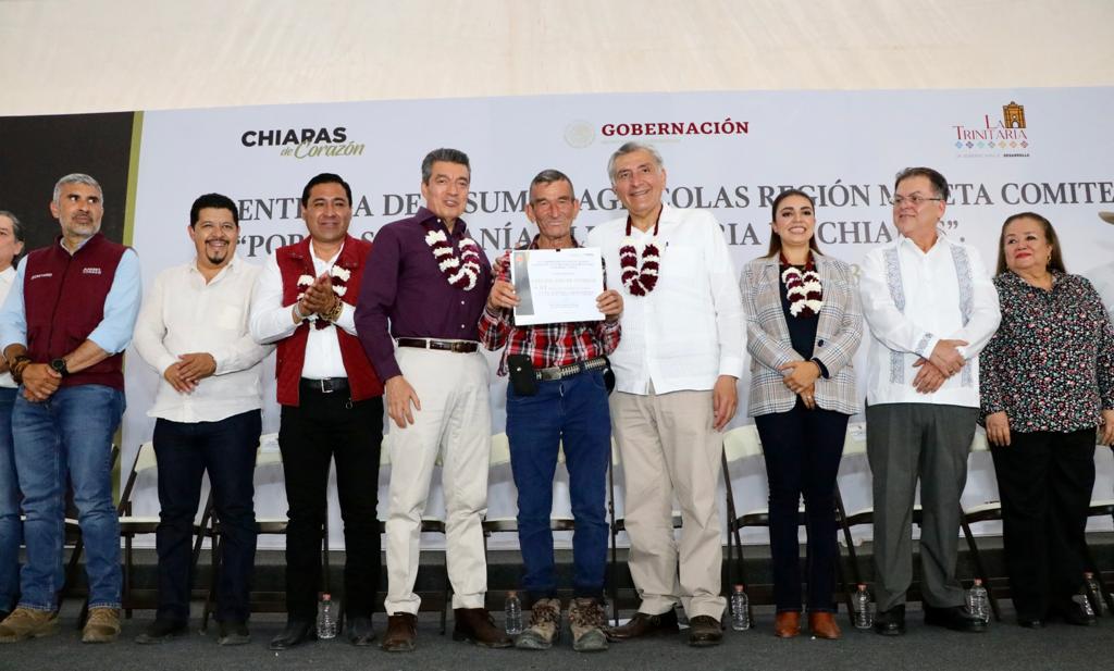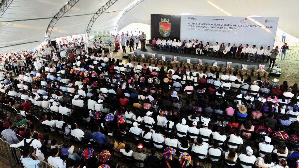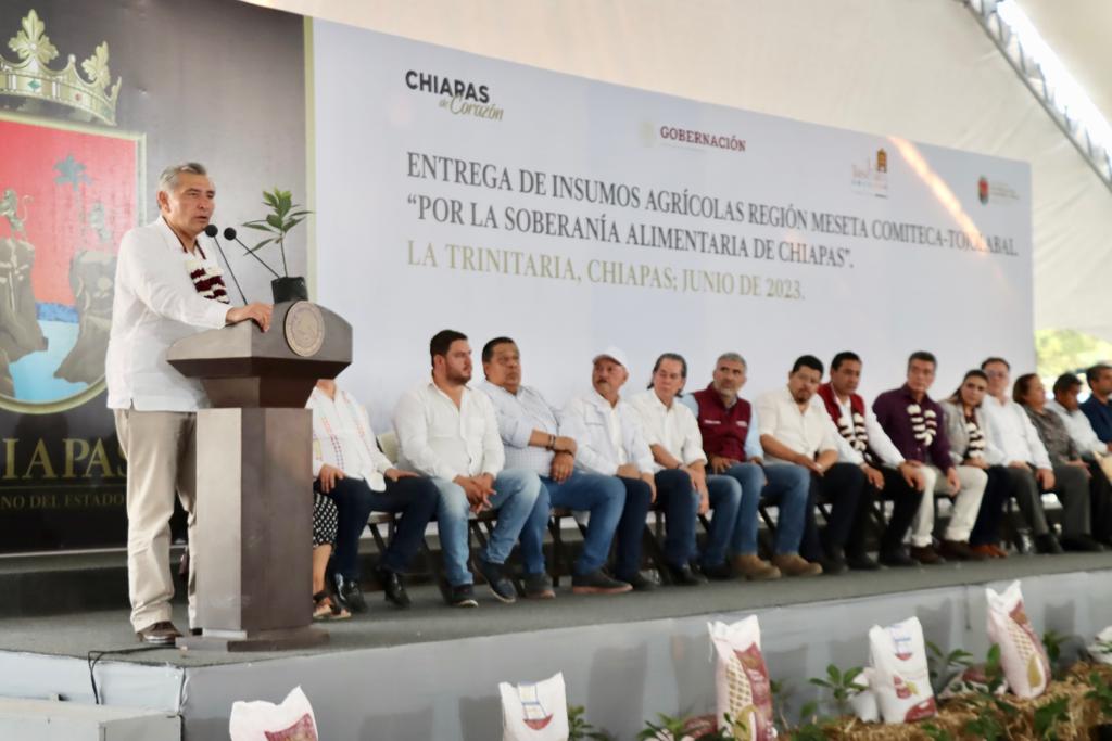 Con el lema “Por la Soberanía Alimentaria de Chiapas”, el gobernador Rutilio Escandón Cadenas junto con el secretario de Gobernación, Adán Augusto López Hernández, encabezaron la entrega de paquetes de fertilizantes e insumos agrícolas a productoras y productores de los municipios de la región Meseta Comiteca Tojolabal, con el propósito de coadyuvar al fortalecimiento del campo chiapaneco y garantizar la autonomía alimentaria del país.