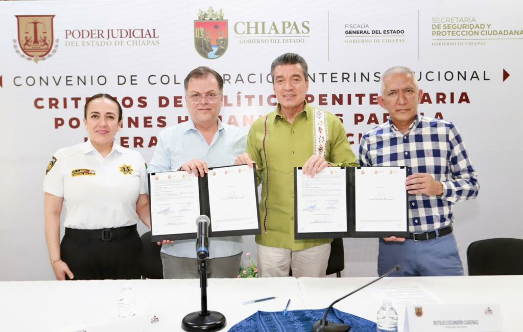 Luego de la firma de este convenio entre el Poder Judicial del Estado (PJE), la Fiscalía General del Estado (FGE) y la Secretaría de Seguridad y Protección Ciudadana (SSyPC), el mandatario celebró que Chiapas evolucione en este importante asunto de las personas que sufren por salud dentro de los reclusorios, a través de instrumentos jurídicos como es el artículo 18 constitucional, que da la pauta para atender de forma humana el sistema penitenciario.