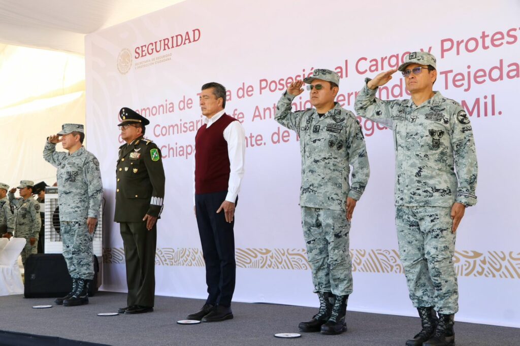 El gobernador Rutilio Escandón Cadenas asistió a la ceremonia de toma de posesión del mando y protesta de bandera del comisario jefe Antonio Hernández Tejeda, como el nuevo coordinador de la Guardia Nacional en Chiapas y comandante de la Séptima Brigada de la Policía Militar.