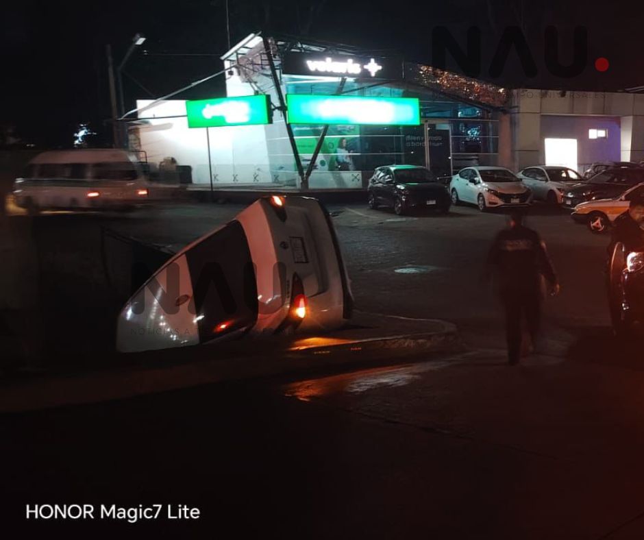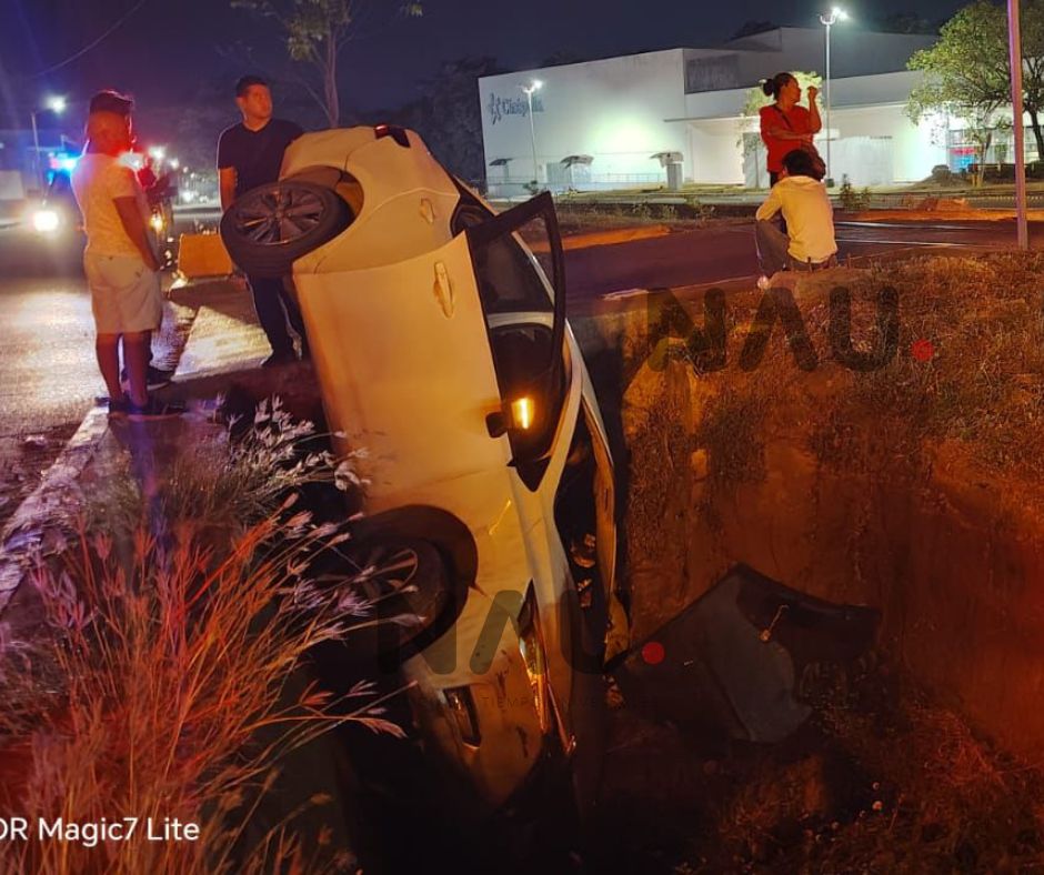 Tapachula, Chiapas; 17 de enero de 2026.— La noche del viernes se registró un accidente vehicular en el par vial de Tapachula, luego de que un automóvil particular cayera a un dren pluvial ubicado sobre la novena avenida Sur, a la altura de Plaza Galerías, lo que dejó únicamente daños materiales y dos personas con alteraciones nerviosas.