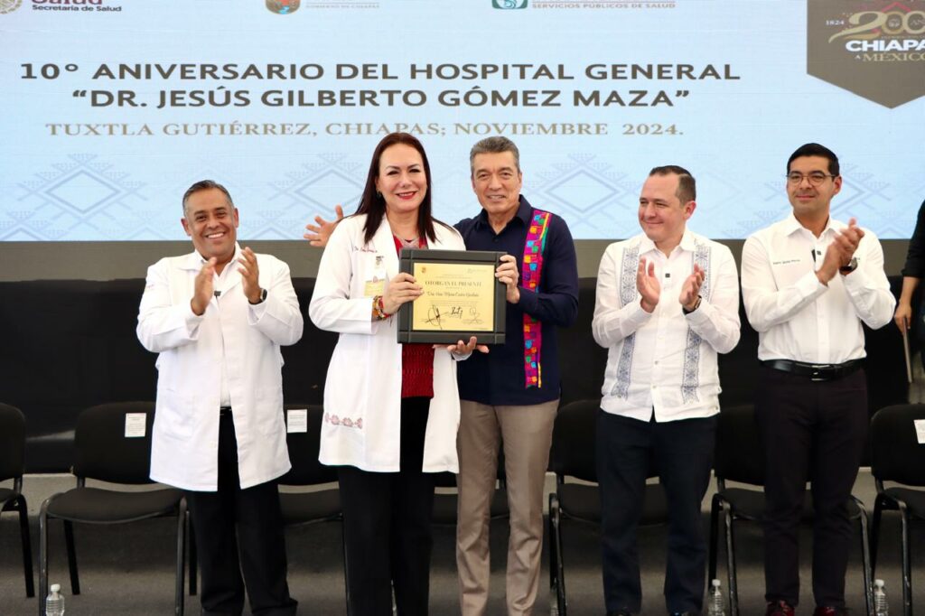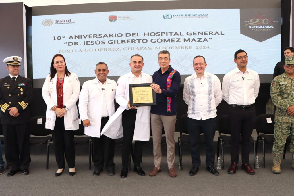 Recordó que “los hospitales del IMSS-Bienestar brindan continuidad a los cuidados de los pacientes referidos desde otros niveles, con un enfoque acorde a la complejidad del padecimiento y con un sentido humanista para la persona y la familia. El Hospital Gómez Maza es valioso no solo para Chiapas sino para la región, por eso en este décimo aniversario felicitamos a todo el personal porque cada uno es pieza clave para que esta unidad funcione y produzca salud a la población”.