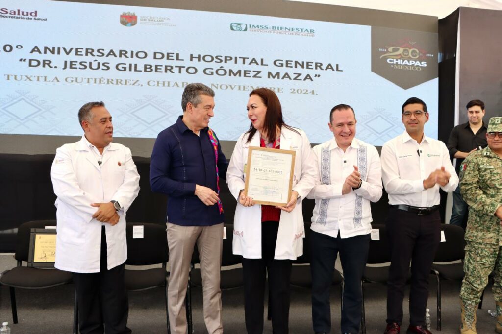 En su intervención, el coordinador federal del IMSS- Bienestar en Chiapas, Roberto Sánchez Moscoso informó que como parte de los festejos, este jueves se entregó al “Gómez Maza” la Licencia para la Disposición de Órganos, Tejidos y Células con Fines Terapéuticos en su modalidad de Trasplante de Riñón y Tejido de Córnea; además, dijo, por parte del gobierno del estado el IMSS-Bienestar recibió títulos de propiedad de 15 unidades médicas.