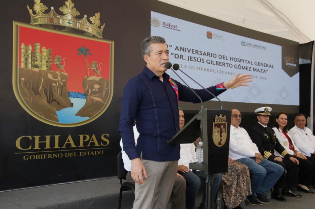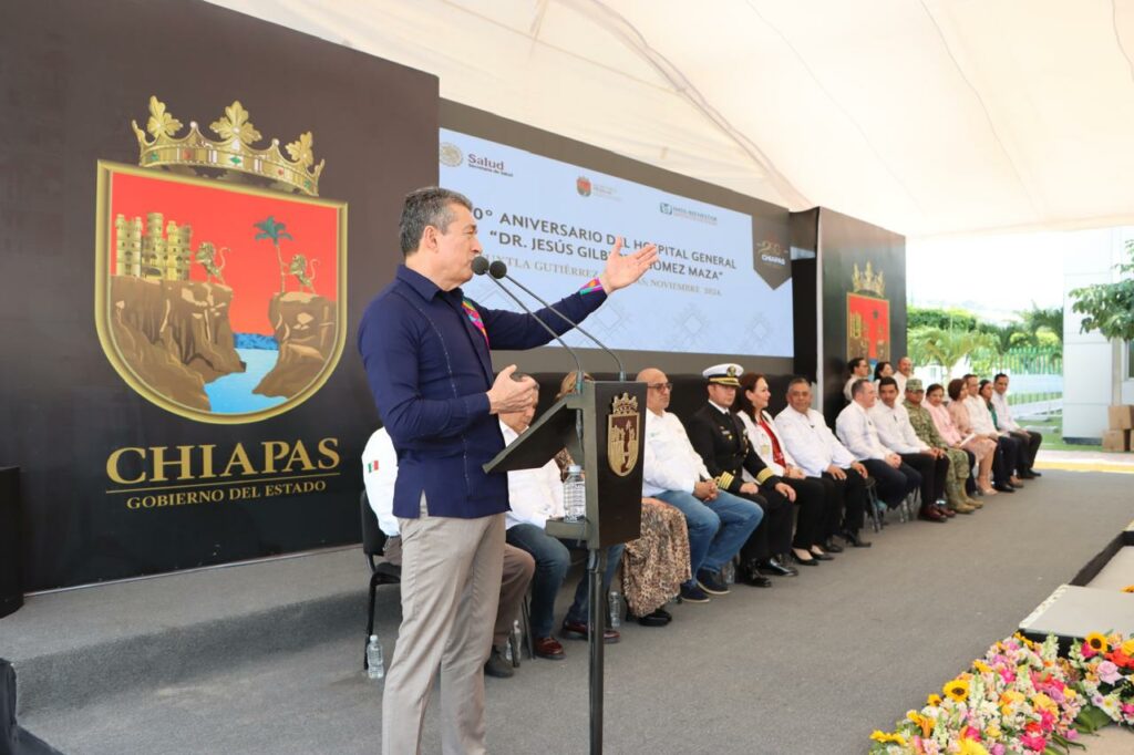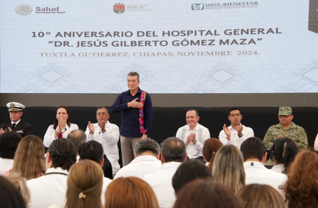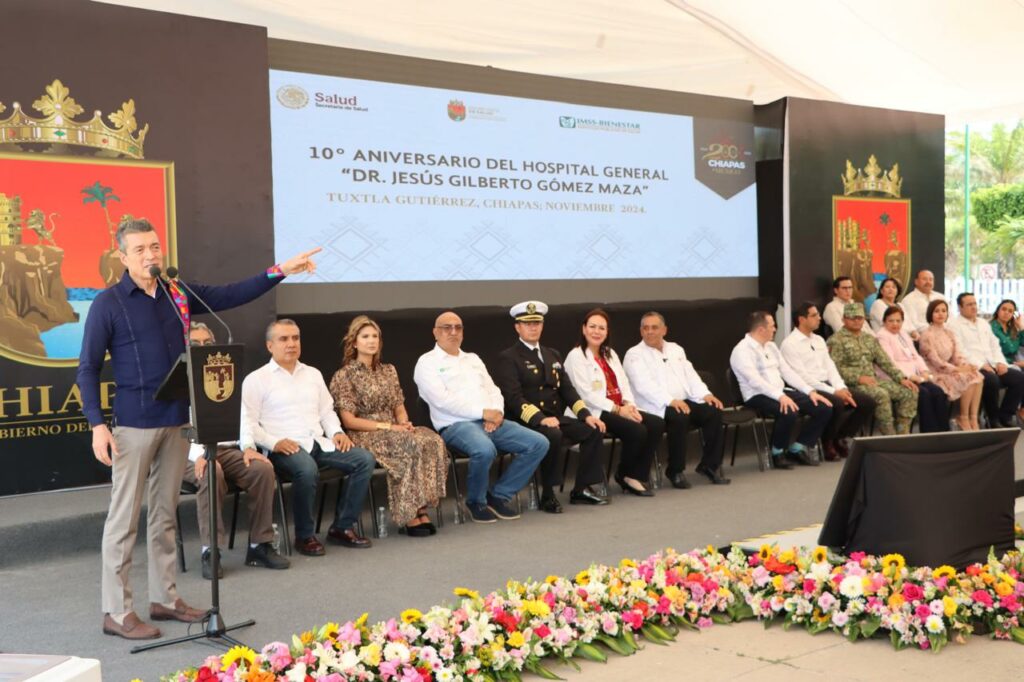 En la celebración del Décimo Aniversario del Hospital General “Dr. Jesús Gilberto Gómez Maza”, de Tuxtla Gutiérrez, el gobernador Rutilio Escandón Cadenas expresó que es un gran orgullo constatar que Chiapas cuenta con esta unidad médica de alta especialidad, que se ha convertido en una de las más grandes e importantes del país, gracias a la calidad de los servicios de salud que se brindan de manera gratuita y universal a la población.