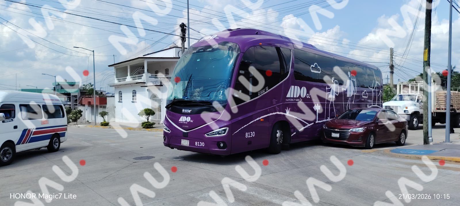 En ese momento, un vehículo Chevrolet Onix color guinda continuó su trayecto sobre la misma vía. Según lo señalado por la conductora, el autobús ya se encontraba realizando la maniobra de incorporación, lo que derivó en un impacto lateral entre ambas unidades.
