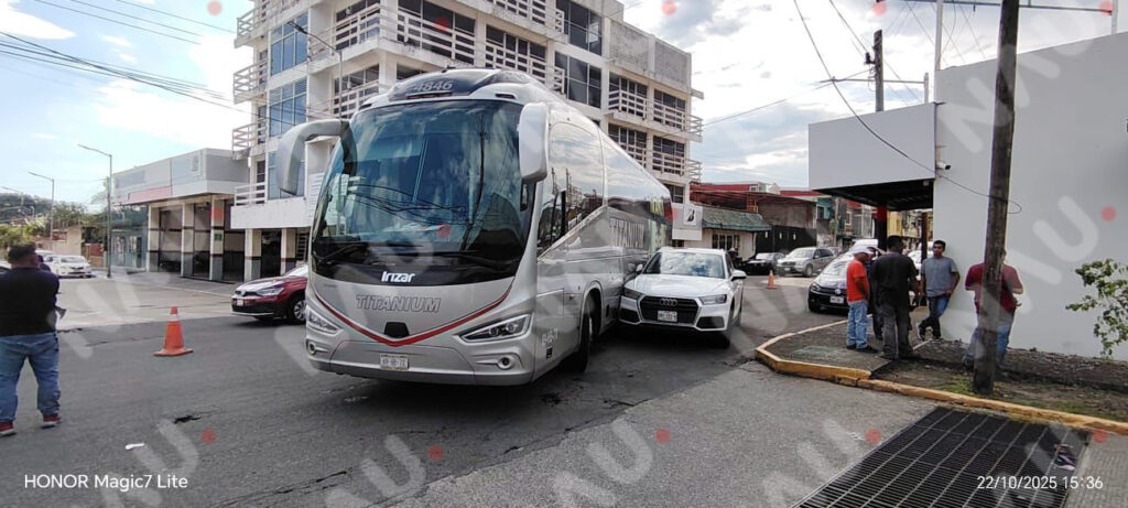 Tapachula, Chiapas. — Un accidente vehicular registrado la tarde de este miércoles provocó un considerable congestionamiento vial en una de las zonas más transitadas del centro de Tapachula, luego de que un vehículo de transporte de una conocida línea, ubicada sobre la 17ª Calle Oriente, realizara un corte de circulación a una camioneta de la marca Audi, color blanco, cuando intentaba ingresar a uno de los andenes.