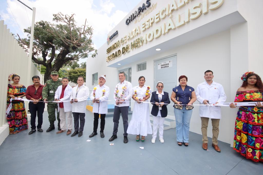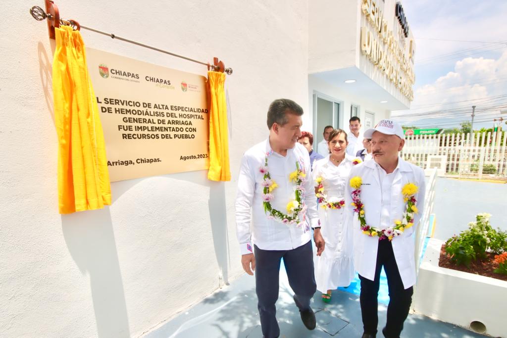 Durante la inauguración del Servicio de Alta Especialidad en Hemodiálisis para la atención de pacientes con enfermedades renales, ubicado en el Hospital General Juárez, del municipio de Arriaga, el gobernador Rutilio Escandón Cadenas destacó que estos avances en materia de salud dan muestra del interés de este gobierno de que los más desprotegidos tengan acceso a servicios gratuitos y de calidad.