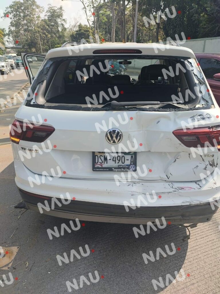 Al arribar al lugar localizaron la unidad de pasaje de la ruta Laureles 1 – Centro conducido por Jorge Enrique M de 23 años de edad, mismo que se había impactado en la parte trasera de un vehículo tipo Tiguan de color blanco modelo 2018, con placas del Estado de Chiapas, Conducido por Michel N de 29 años de edad con domicilio en ciudad Hidalgo.