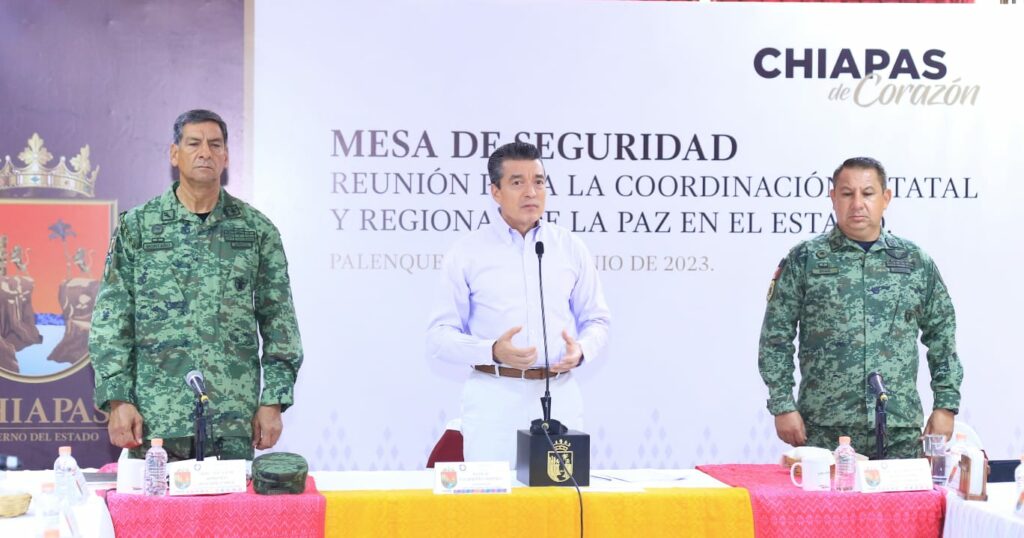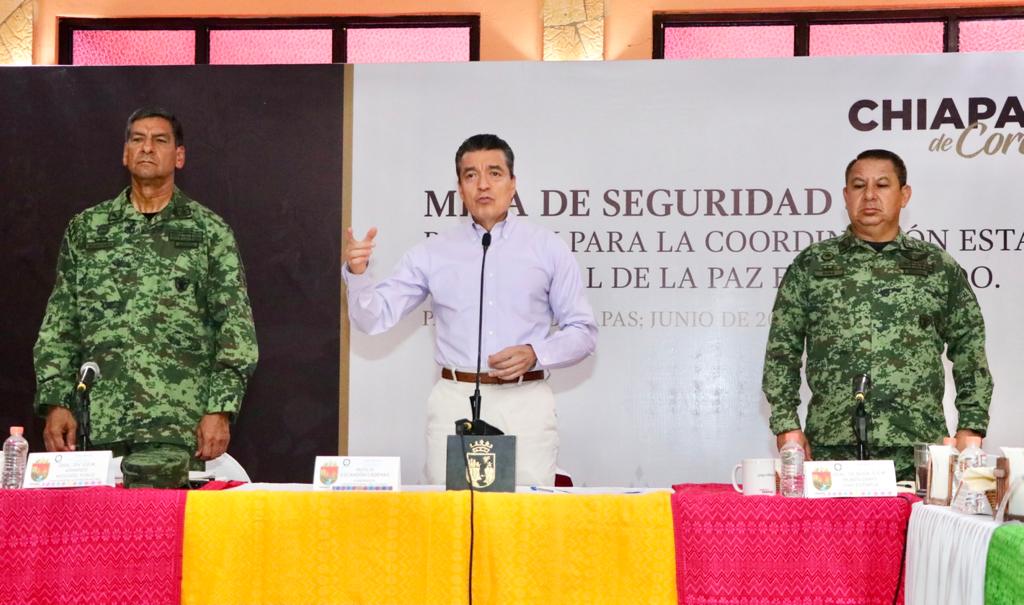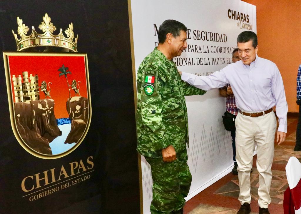 Los representantes de la VII Región Militar, Armando Montaño Ponce; de la 38 Zona Militar, Rubén Darío Díaz Esparza; de la 31 Zona Militar, Juvenal Cortés González; de la 36 Zona Militar, José Joaquín Cueto; de la 39 Zona Militar, Arturo Javier González Jiménez; de la XVI Región Naval, Daniel Valencia Díaz; de la Coordinación Estatal de la Guardia Nacional, Víctor Fernández Mondragón.