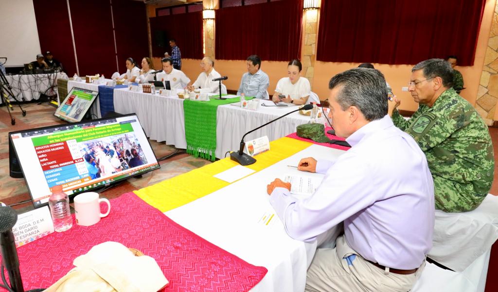 La secretaria de Seguridad y Protección Ciudadana, Gabriela Zepeda Soto, los representantes de la FGR en Chiapas, Víctor Alfredo Lara Molina; de la Oficina de Representación del Instituto Nacional de Migración en Tabasco, Jesús David Lorenzana Valdiviezo; de la Secretaría de Protección Civil, Jorge de Jesús Figueroa Córdova; el presidente de la Comisión Estatal de Derechos Humanos, Juan José Zepeda Bermúdez.