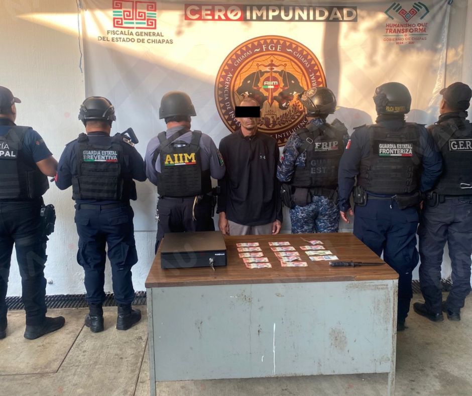 Tapachula, Chiapas; 27 de marzo de 2026.— Elementos de distintas corporaciones de seguridad lograron la detención de un hombre acusado del delito de robo con violencia, durante un operativo realizado en calles del primer cuadro de la ciudad, informó la autoridad.