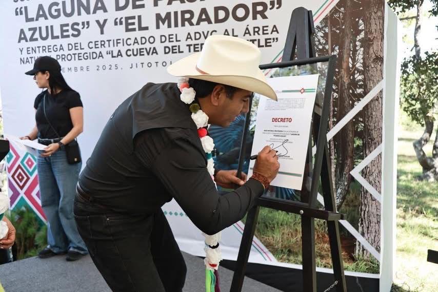 El gobernador Eduardo Ramírez Aguilar encabezó la firma del Decreto de Declaratoria de Áreas Naturales Protegidas con la categoría de Zona Sujeta a Conservación Ecológica para los territorios Laguna de Pájaros Azules y El Mirador, y entregó el certificado de Área Destinada Voluntariamente a la Conservación (ADVC) del Área Natural Protegida La Cueva de Tepezcuintle, en el municipio de Jitotol.
