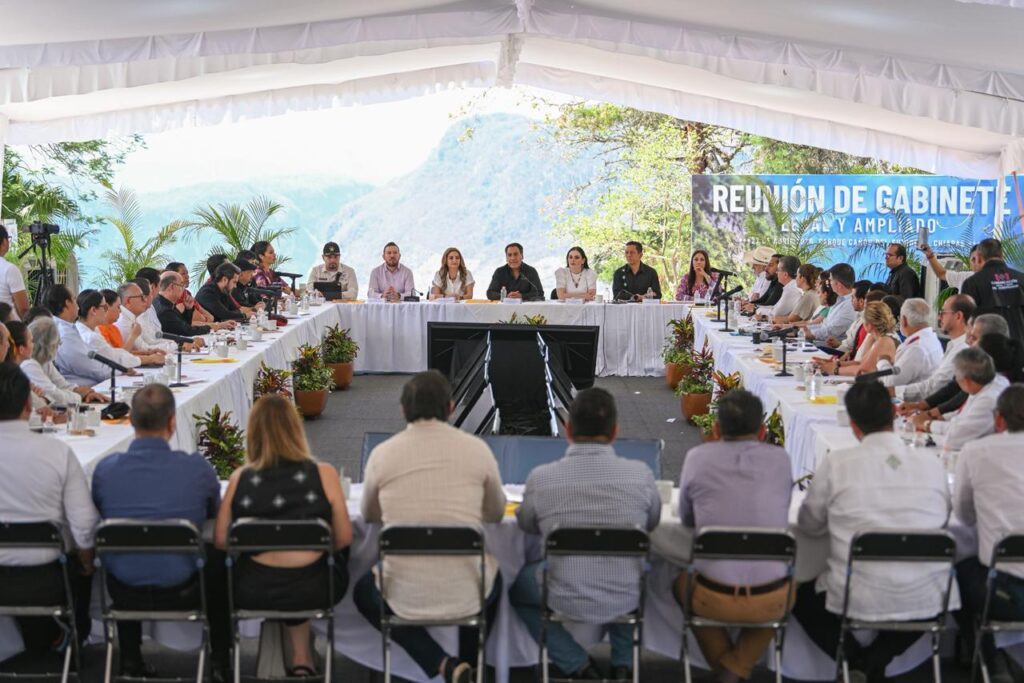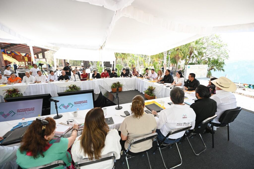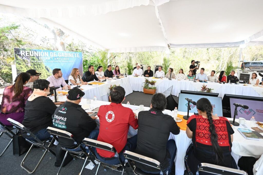 El gobernador Eduardo Ramírez Aguilar encabezó una reunión con integrantes del Gabinete Legal y Ampliado desde el Mirador Los Chiapa, en el Parque Nacional Cañón del Sumidero, donde destacó los avances de la administración pública estatal y convocó a las servidoras y los servidores del pueblo a actuar con conciencia, responsabilidad social y vocación de servicio, con el propósito de fortalecer el bienestar y la prosperidad de Chiapas, en especial en los 12 municipios históricamente olvidados.