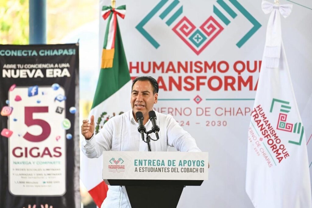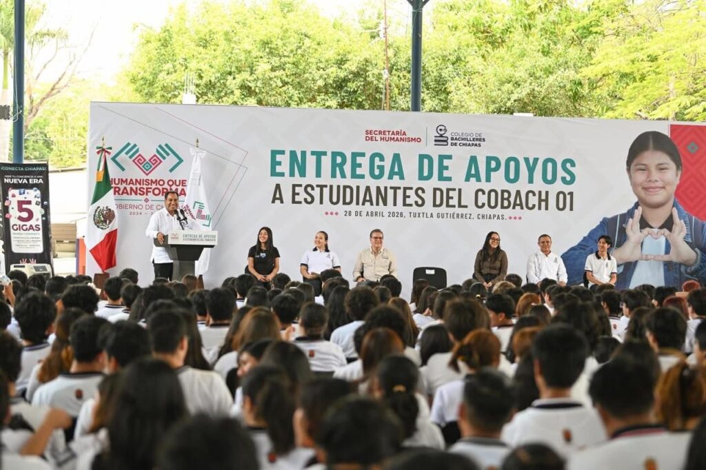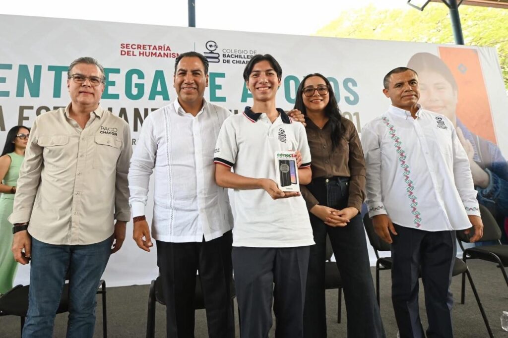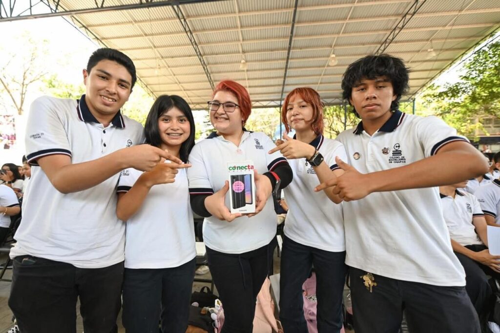 Durante la entrega de teléfonos celulares del programa Conecta Chiapas a estudiantes del Colegio de Bachilleres de Chiapas (Cobach), Plantel 01, en Tuxtla Gutiérrez, el gobernador Eduardo Ramírez Aguilar destacó que estos apoyos constituyen una herramienta tecnológica que facilitará sus actividades escolares y les permitirá mantenerse comunicados con sus familiares.