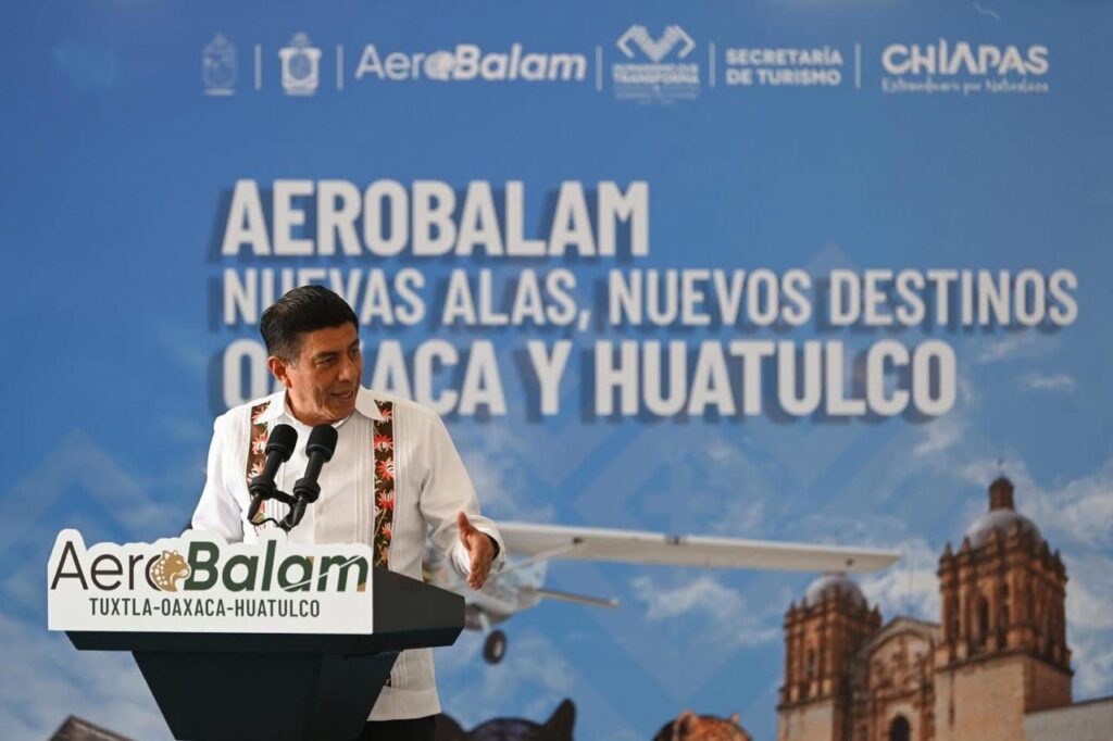 Más tarde, ambos mandatarios inauguraron el vuelo de AeroBalam que conectará a Tuxtla Gutiérrez con Oaxaca y Huatulco. Ramírez Aguilar afirmó que este paso amplía la conectividad entre Chiapas y el sur de México, y explicó que se trata de la primera ruta que se consolida hacia el exterior del estado. Añadió que la meta es abrir nuevos destinos hacia la Selva Lacandona, Veracruz, Guatemala y Houston.