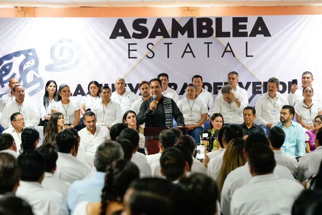 En asamblea estatal, tras una votación unánime, la dirigente nacional del Partido Verde Ecologista de México (PVEM), Karen Castrejón Trujillo y la presidenta del Comité Ejecutivo Estatal, Valeria Santiago Barrientos, entregaron a Eduardo Ramírez Aguilar la constancia de ratificación que lo avala como candidato para el gobierno de 2024 a 2030.