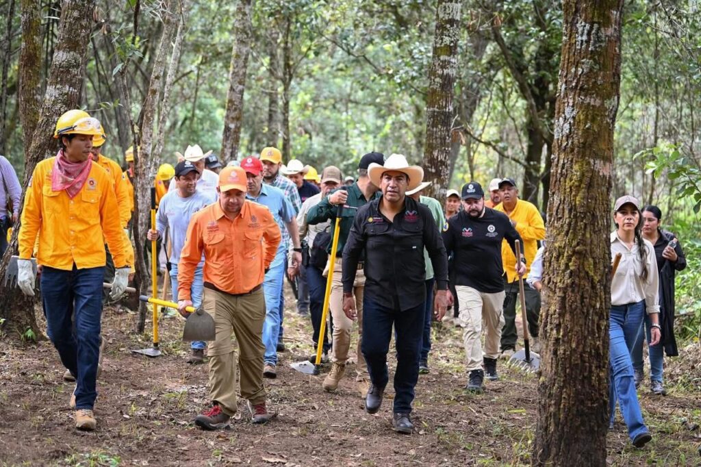 Acompañado por combatientes, personal de Protección Civil, ejidatarios y autoridades federales, estatales y municipales, el mandatario remarcó que esta estrategia preventiva, basada en la coordinación entre pueblo y gobierno, no solo pretende disminuir los daños ocasionados por los siniestros, sino también contribuir al cuidado de la madre tierra.