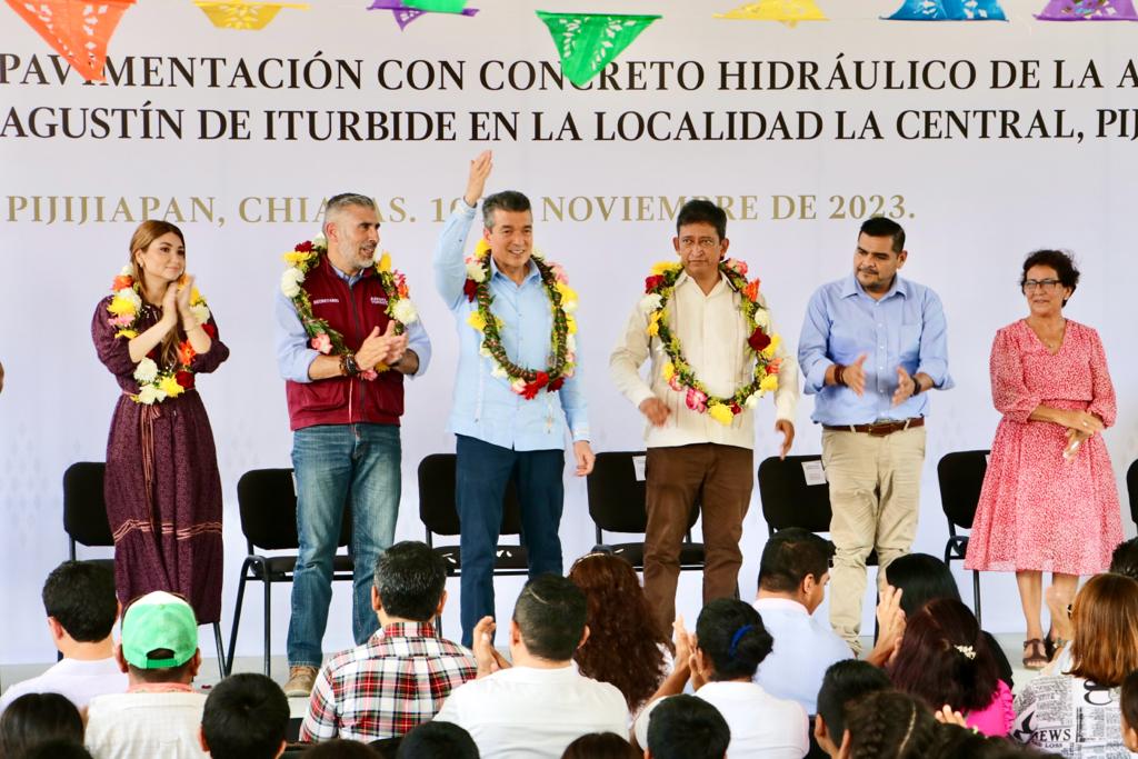 En el municipio de Pijijiapan, el gobernador Rutilio Escandón Cadenas inauguró la pavimentación con concreto hidráulico de la Avenida Agustín de Iturbide, en la localidad La Central, donde destacó que esta obra, además de modernizar y mejorar la imagen urbana, detonará las actividades sociales y comerciales, y fortalecerá la seguridad de la población.