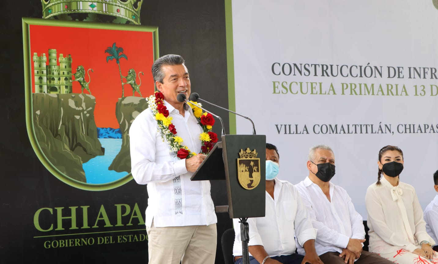En Villa Comaltitlán, el gobernador Rutilio Escandón Cadenas encabezó la inauguración de la construcción de infraestructura física educativa de la Escuela Primaria 13 de Enero, donde destacó que la educación es un tema prioritario en su gobierno, por ello ha asumido el compromiso de invertir en este rubro, con el objetivo de que estudiantes y docentes puedan llevar a cabo el proceso de enseñanza-aprendizaje y las actividades de convivencia escolar en espacios funcionales, dignos y seguros.