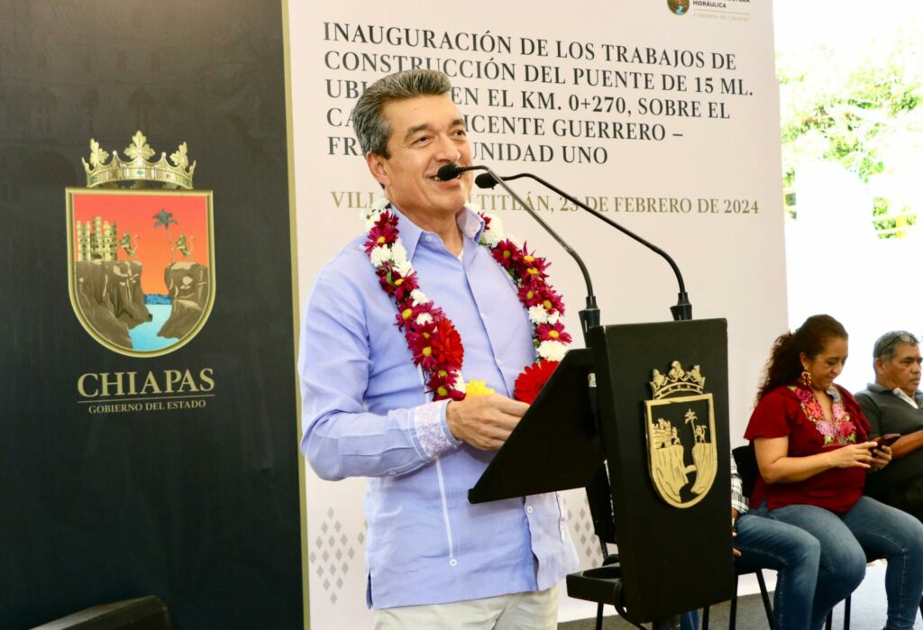 En la inauguración de los trabajos de construcción del puente vehicular ubicado en el kilómetro 0+270 sobre el camino Vicente Guerrero-Fracción Unidad Uno, en el municipio de Villa Comaltitlán, el gobernador Rutilio Escandón Cadenas destacó que esta obra fortalece la seguridad vial, la conectividad regional y las actividades sociales, económicas y comerciales en la Región Soconusco.