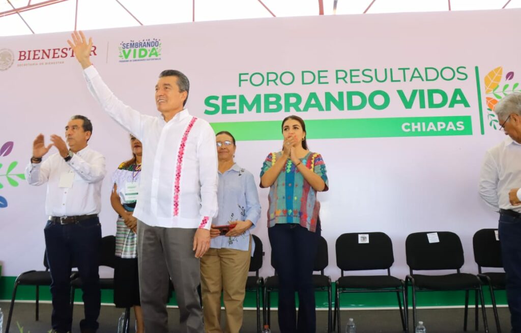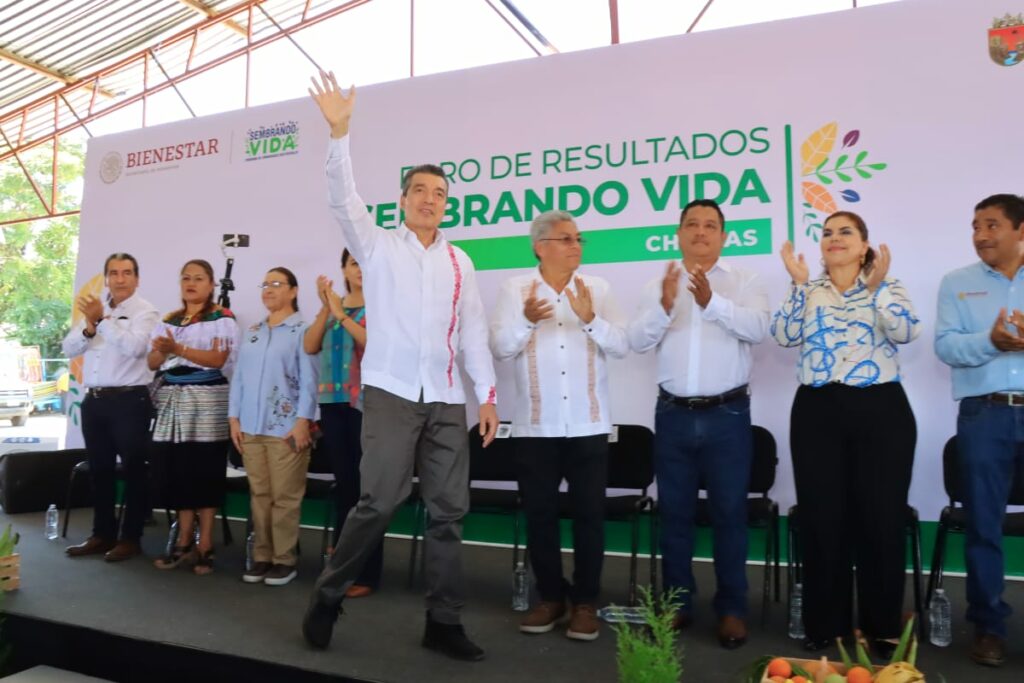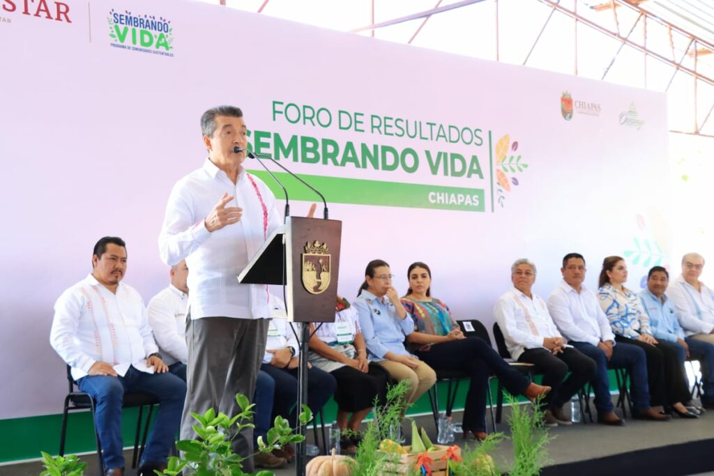 Durante el Foro de Resultados del Programa Sembrando Vida en Chiapas, el gobernador Rutilio Escandón Cadenas destacó que esta iniciativa visionaria, impulsada por el presidente Andrés Manuel López Obrador, se ha convertido en una de las más importantes porque cuida la ecología, proporciona empleo, fortalece la economía y la productividad, así como la seguridad y autonomía alimentaria de los pueblos de Chiapas y México.