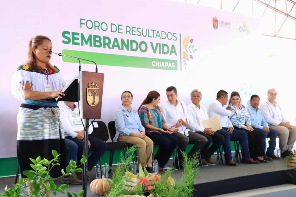 En representación de las y los sembradores del Programa Sembrando Vida, del municipio de Ocosingo, Reyna Cruz Toledo expresó su gratitud al gobernador Rutilio Escandón y al presidente López Obrador, por impulsar este programa que está dando frutos y ha logrado superar la meta en la siembra de árboles frutales y maderables