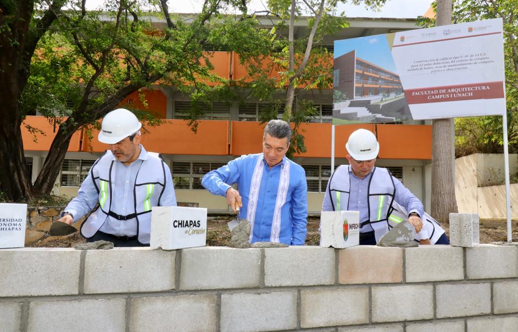A su vez, el director general del Instituto de Infraestructura Física Educativa del Estado de Chiapas (Inifech), Enoc Gordillo Argüello, informó que para este proyecto se destinan 29.5 millones de pesos para la Facultad de Arquitectura, Campus Tuxtla Gutiérrez, y 21.6 millones para la Facultad de Medicina Humana, en Tapachula, al tiempo de destacar que se trabaja en obras de tres facultades más, lo que garantiza espacios más seguros y confiables para la comunidad estudiantil.
