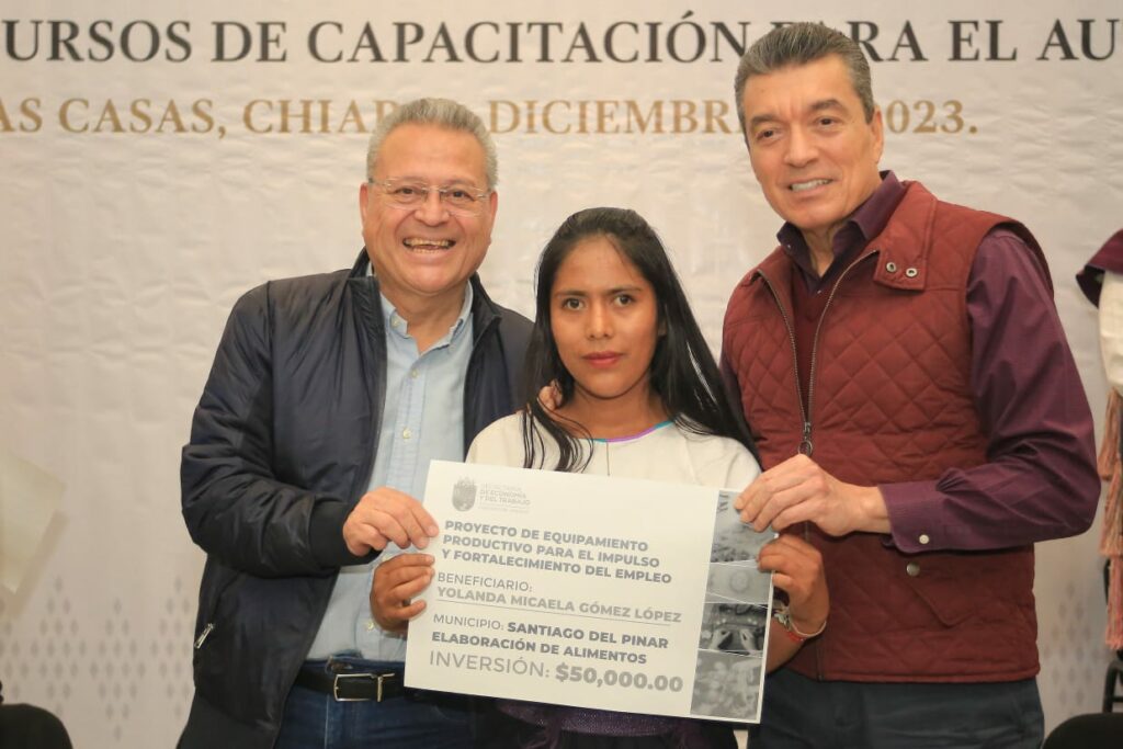 Por su parte, el secretario de Economía y del Trabajo, Carlos Salazar Estrada, destacó la alianza con el Instituto de Capacitación y Vinculación Tecnológica de Chiapas, con el que en esta ocasión se realizaron 33 cursos en beneficio de 387 personas de los municipios de Amatenango del Valle, Chamula, Chanal, Huixtán, Mitontic, San Cristóbal de Las Casas, Santiago El Pinar y Zinacantán, de las cuales el 80 por ciento son mujeres.