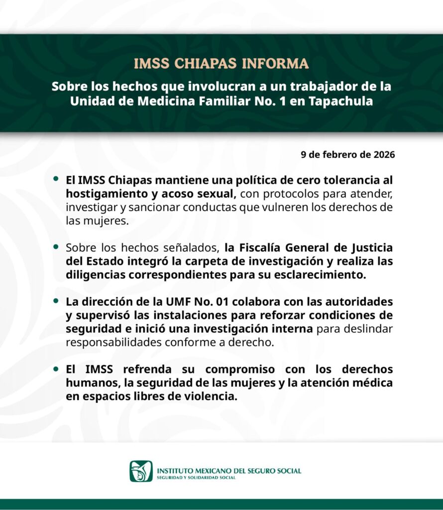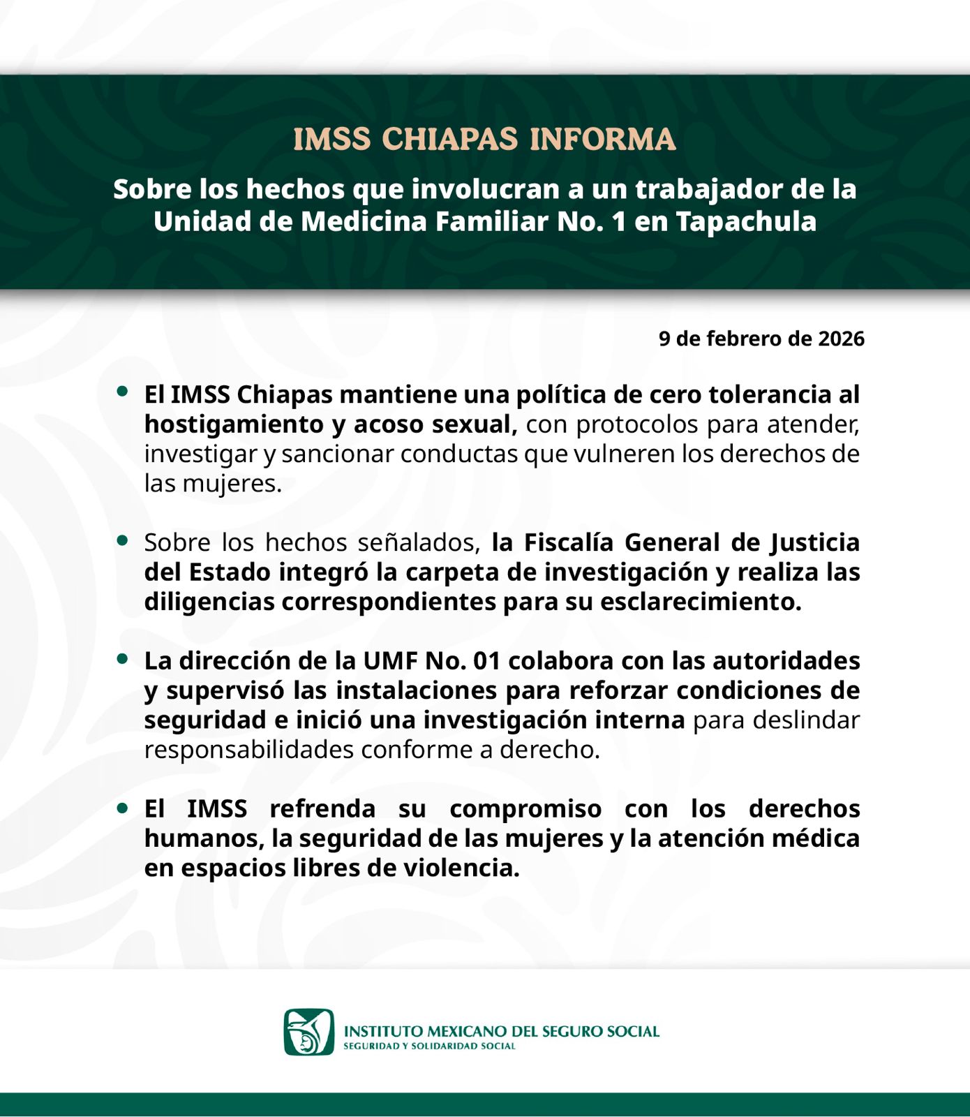 El IMSS Chiapas informó sobre los hechos que involucran a un trabajador de la Unidad de Medicina Familiar No. 1, ubicada en Tapachula, reiterando su política de cero tolerancia al hostigamiento y acoso sexual, así como su compromiso con la protección de los derechos de las mujeres.