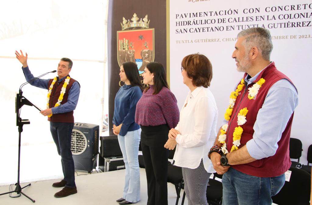 Estuvieron presentes: la directora general del Centro Estatal de Prevención Social de la Violencia y Participación Ciudadana, Emma Itzel Orantes Ortega; la directora general del DIF Chiapas, Deliamaría González Flandez; la diputada presidenta de la Comisión de Desarrollo Urbano y Obras Públicas, Yolanda Correa González; y las diputadas locales Flor de María Esponda Torres y Paola Villalmonte Pérez, así como habitantes de la colonia San Cayetano.