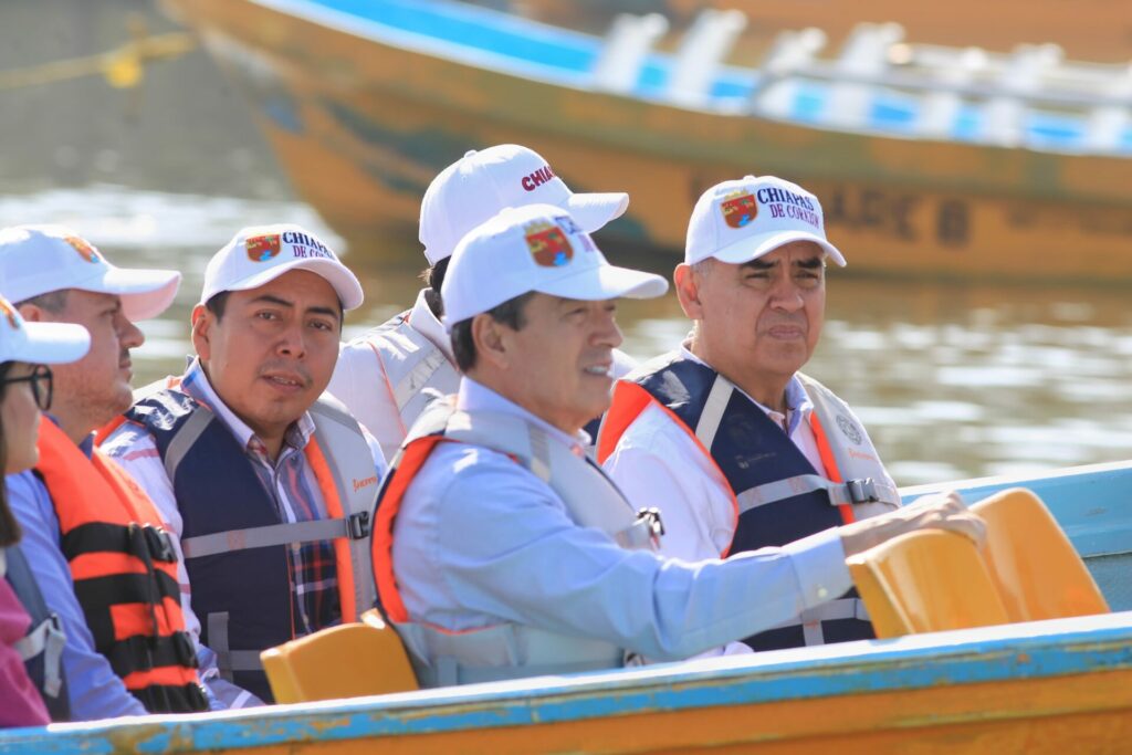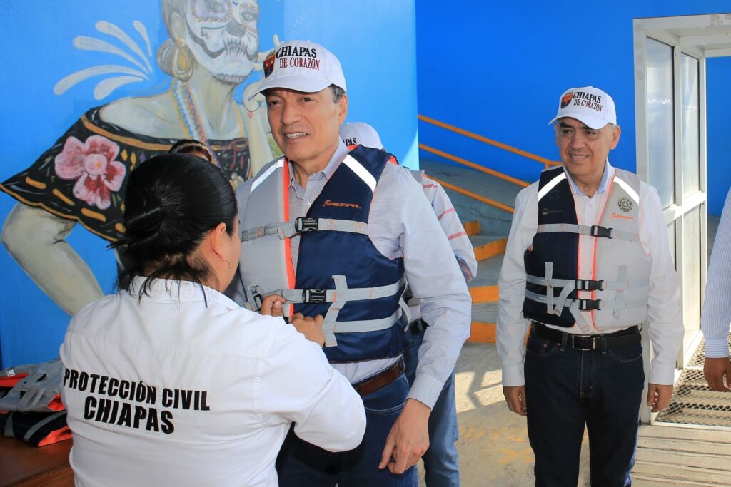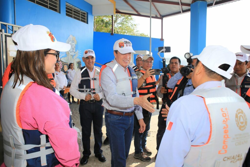 Acompañaron al mandatario estatal, el secretario de Protección Civil, Luis Manuel García Moreno; las secretarias de Medio Ambiente de Historia Natural, María del Rosario Bonifaz Alfonzo, y de Turismo, Katyna de la Vega Grajales, la encargada del despacho de la delegación de Semarnat en Chiapas, Guadalupe de la Cruz Guillén; el director regional Frontera Sur Istmo y Pacífico Sur de la Conanp, Pavel Palacios Chávez; la capitana de Puerto de Chiapa de Corzo de la Semar, Josefa Nayeli Pérez Aguilar, entre otros.