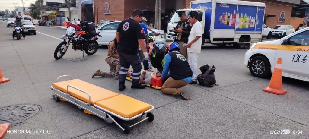 Tras el fuerte impacto, la conductora de la motoneta, quien viajaba sola, salió proyectada y terminó sobre la cinta de concreto, resultando con lesiones en la pierna derecha y golpes a la altura de las cervicales.