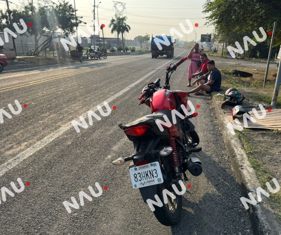 Tapachula, Chiapas.— Un motociclista y un ciclista resultaron con diversas lesiones luego de protagonizar un choque por alcance sobre la carretera del Libramiento Sur, a escasos metros del entronque con el camino a la pista, la mañana de este miércoles.