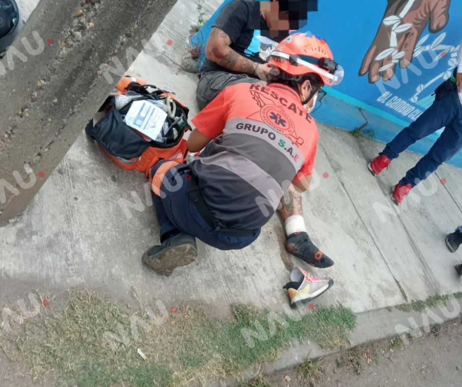 Los paramédicos localizaron a Tito “N”, de 29 años de edad, quien presentaba dolor en el hombro izquierdo y muñeca izquierda, así como una herida abrasiva de aproximadamente cinco centímetros en el brazo izquierdo. El paciente recibió limpieza y vendaje de la lesión, además de la toma de signos vitales para descartar complicaciones mayores.