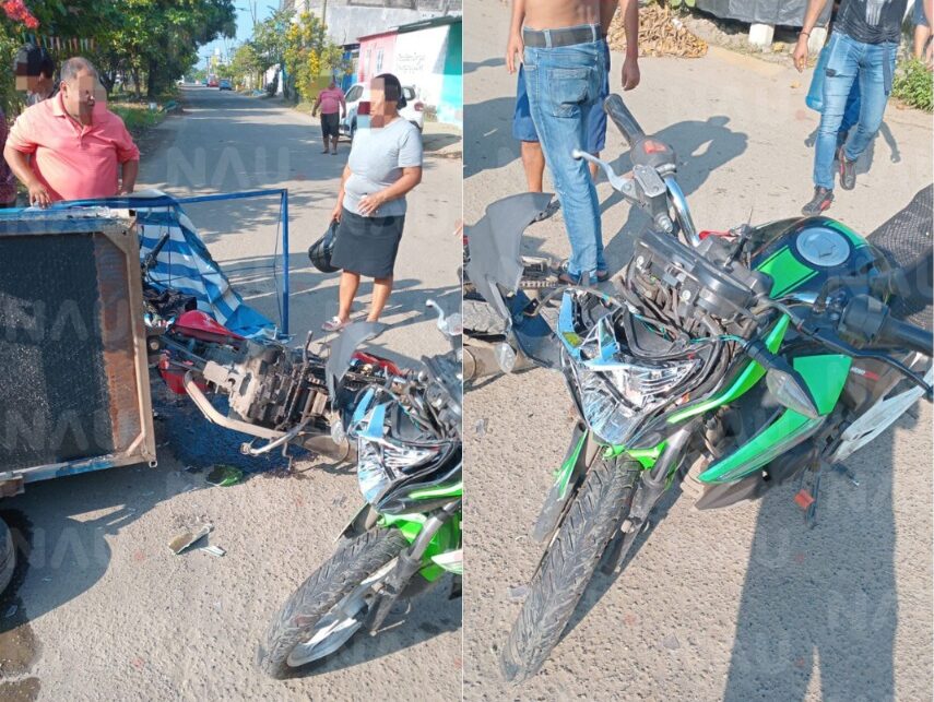 Tapachula, Chiapas; martes 11 de noviembre de 2025. — Una mujer resultó lesionada luego de que el mototriciclo en el que viajaba fuera impactado por una motocicleta sobre la avenida principal de la colonia Cafetales, al suroriente de Tapachula.