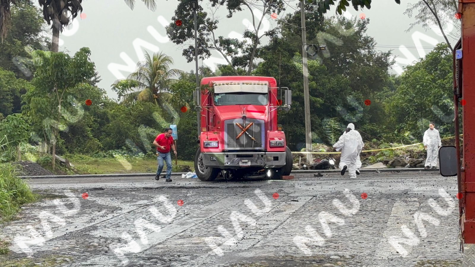 Tapachula, Chiapas. — Un accidente se registró la tarde de este martes sobre el Libramiento Sur Oriente, a la altura del fraccionamiento Los Palacios, donde un tráiler color rojo impactó a dos motocicletas en las que viajaban presuntos elementos de la Armada de México.