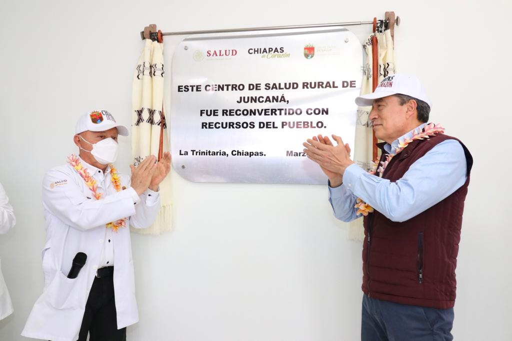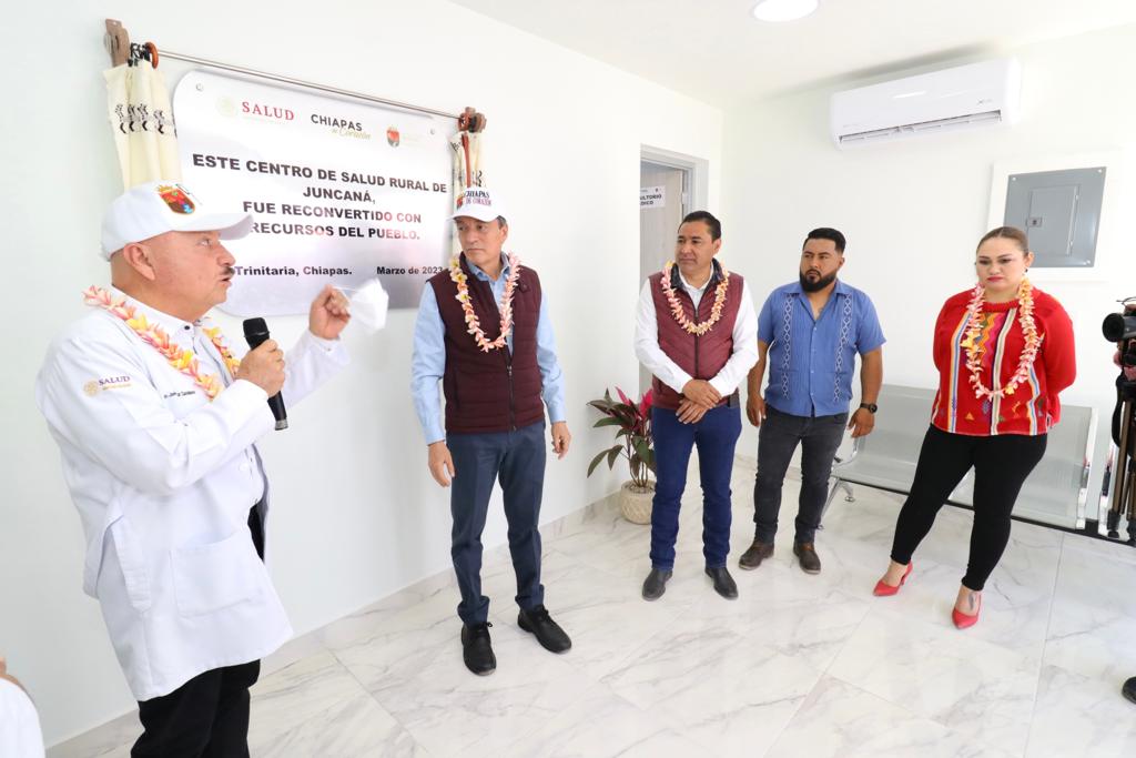 En el municipio de La Trinitaria, el gobernador Rutilio Escandón inauguró la reconversión del Centro de Salud de la localidad Juncaná, donde destacó que, gracias al trabajo honesto, responsable y de combate a la corrupción, los recursos públicos alcanzan para rehabilitar, construir, equipar y mejorar integralmente la infraestructura de salud, tanto en las zonas urbanas como rurales de Chiapas.
