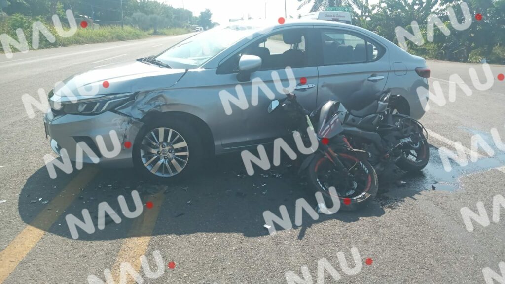 Se presume que el conductor del vehículo Honda intentó incorporarse a la carretera costera, pero lo hizo sin precaución y le hizo corte de circulación al conductor de la motocicleta .