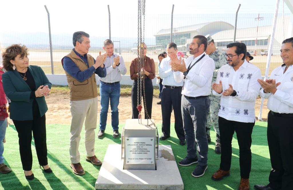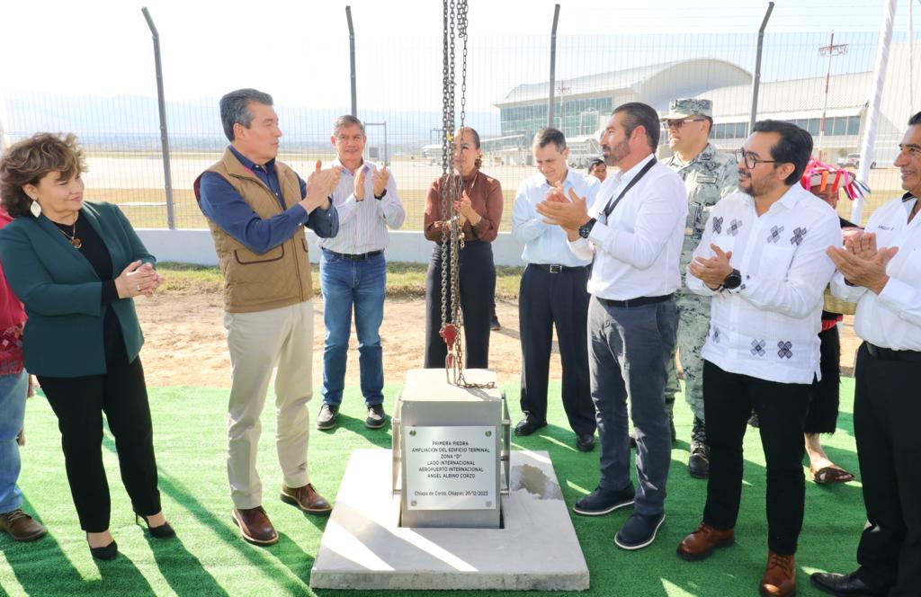 El gobernador Rutilio Escandón Cadenas encabezó la colocación de la primera piedra de una segunda ampliación del Aeropuerto Internacional “Ángel Albino Corzo”, donde destacó que el incremento a esta infraestructura aeroportuaria es un indicativo no solo del incremento de la afluencia de pasajeros y visitantes al estado, sino también del crecimiento económico que se está teniendo en Chiapas, aunado a que, con ello, se consolida una terminal moderna y funcional.