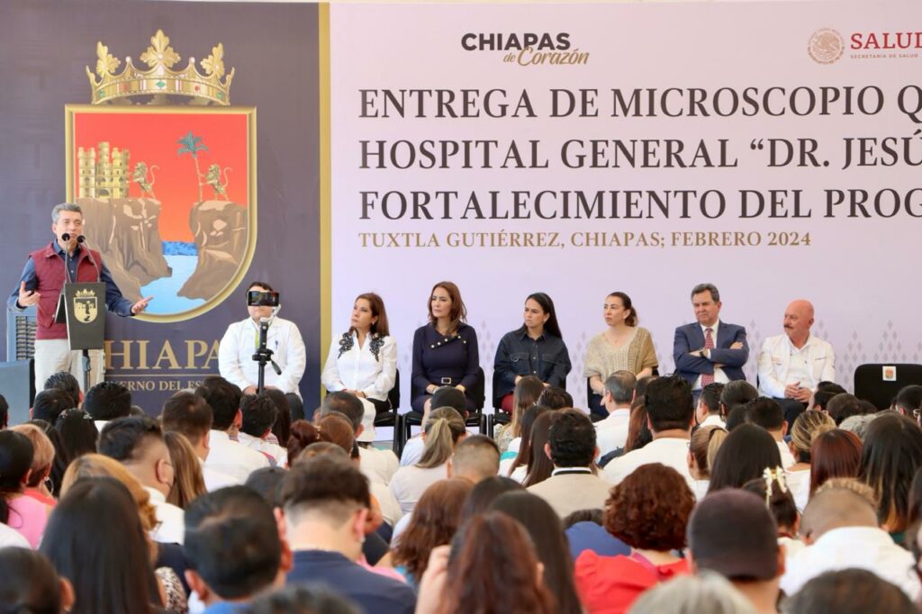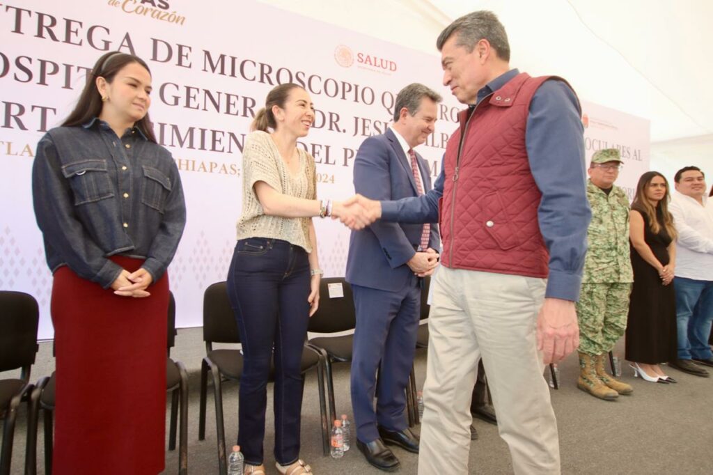 El gobernador Rutilio Escandón Cadenas encabezó la entrega de un microscopio quirúrgico para cirugías oculares, donado al Hospital General Dr. Jesús Gilberto Gómez Maza, en Tuxtla Gutiérrez, donde subrayó que con ello Chiapas se sigue colocando a la vanguardia en materia de salud, pues a través de este equipo, dijo, se fortalecerá la atención a la población con discapacidad visual e incrementará la calidad de las cirugías para la eliminación de cataratas y colocación de lentes intraoculares.
