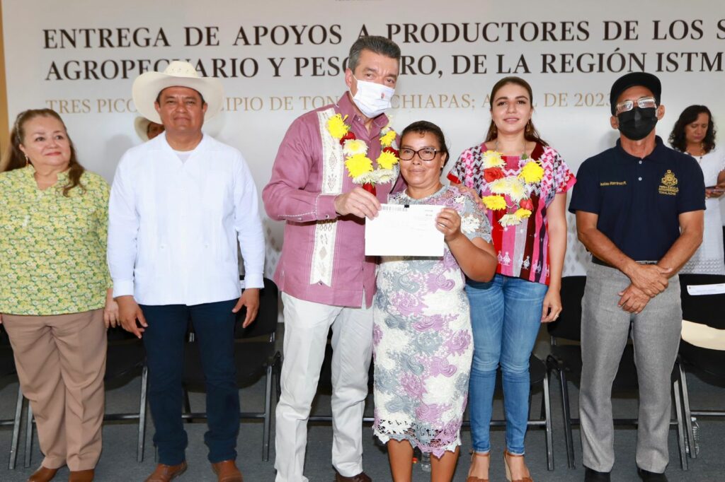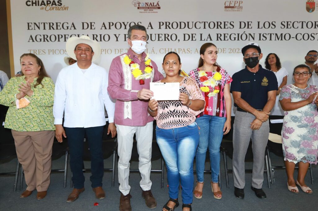En la entrega de insumos a productoras y productores de los sectores agropecuario y pesquero de la Región Istmo-Costa, el gobernador Rutilio Escandón Cadenas resaltó que este gobierno ha asumido el compromiso de fortalecer las cadenas productivas con el objetivo de elevar la productividad, fortalecer la economía en las zonas rurales, mejorar la calidad de vida de quienes viven y trabajan en el campo, así como garantizar la soberanía y seguridad alimentaria de Chiapas y México.