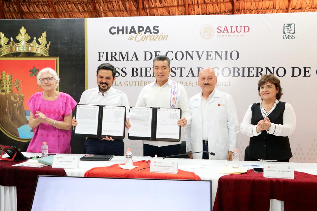 El gobernador Rutilio Escandón Cadenas y el director general del Instituto Mexicano del Seguro Social (IMSS), Zoé Robledo Aburto, encabezaron la firma del Convenio IMSS-Bienestar para la implementación del Modelo de Atención de la Salud, que tiene el objetivo de brindar atención médica gratuita, universal y de calidad a población sin seguridad social.