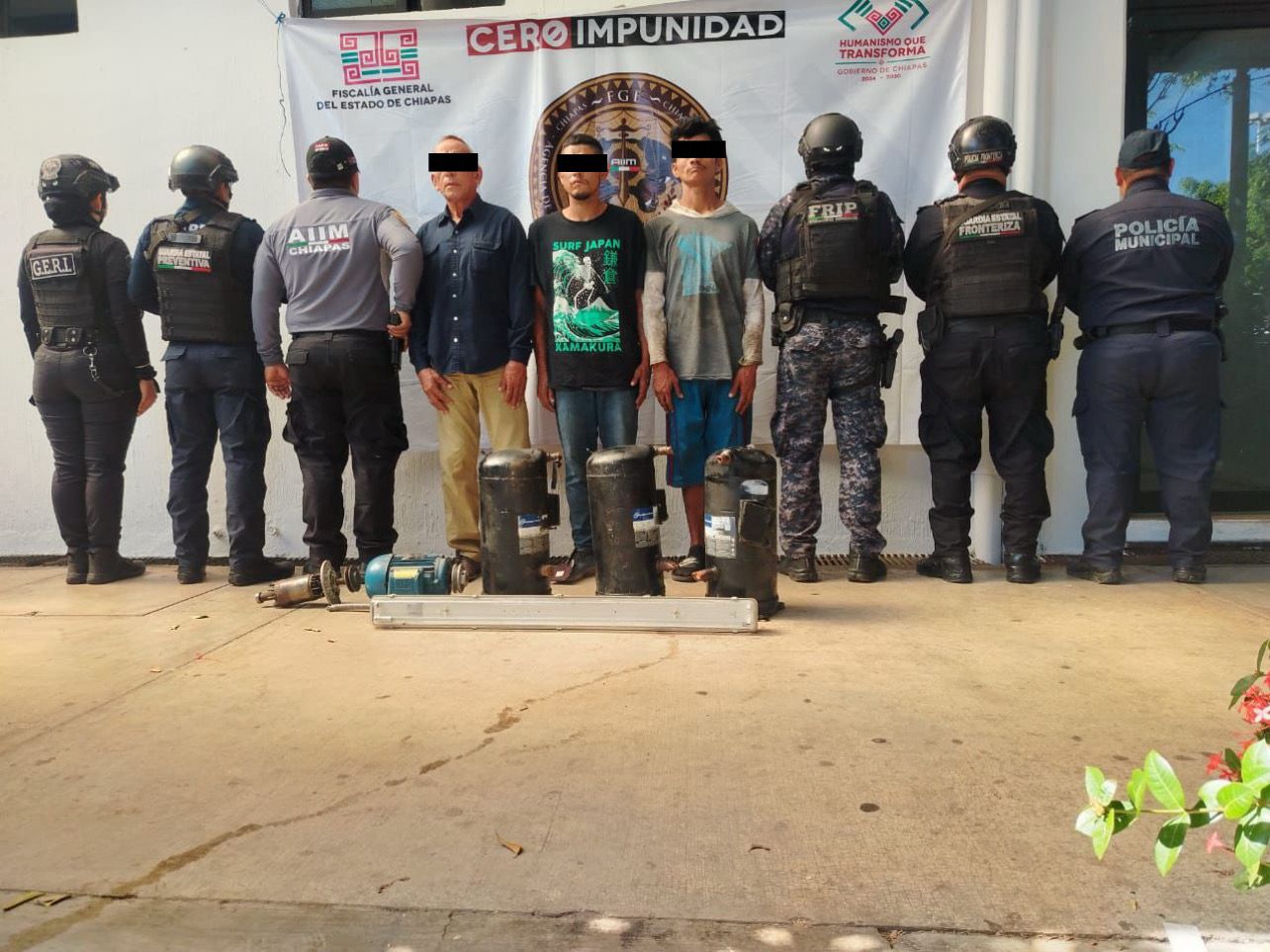 Tapachula, Chiapas; 21 de enero de 2026.— Un operativo oportuno permitió a corporaciones de seguridad detener a tres personas presuntamente involucradas en el robo de equipo propiedad del Ayuntamiento de Tapachula, sustraído de las instalaciones del Polideportivo municipal, ubicado en la colonia Palmas.
