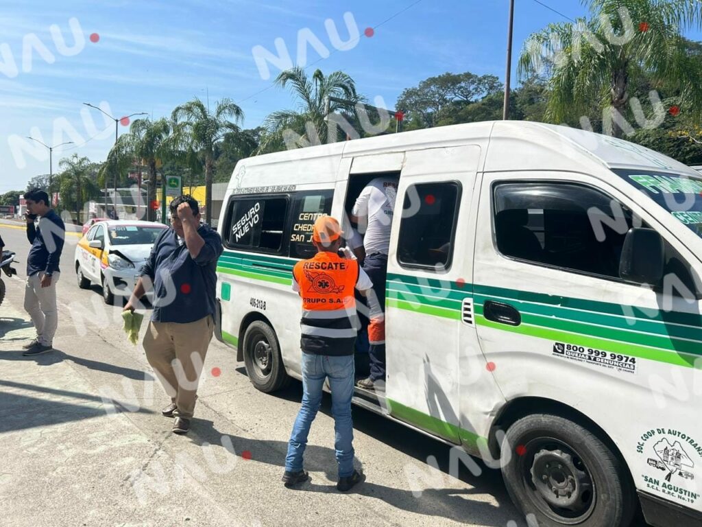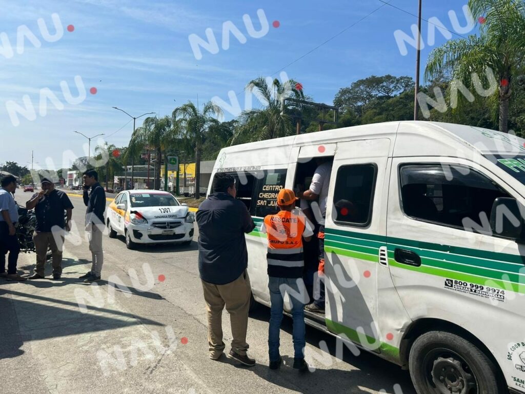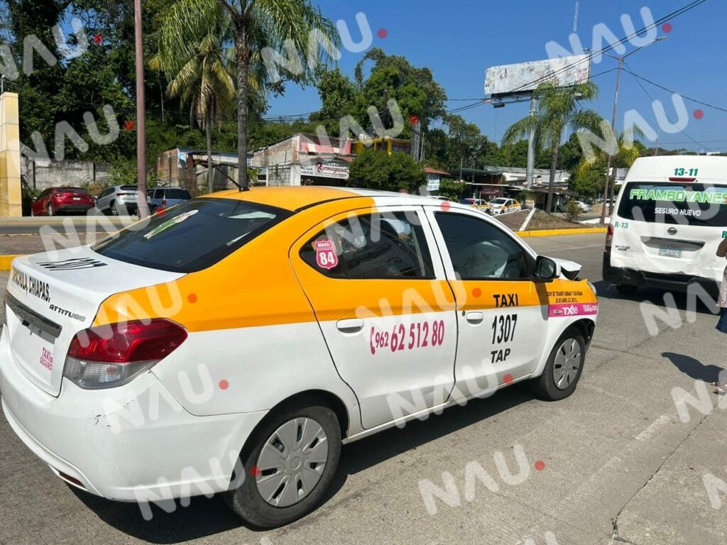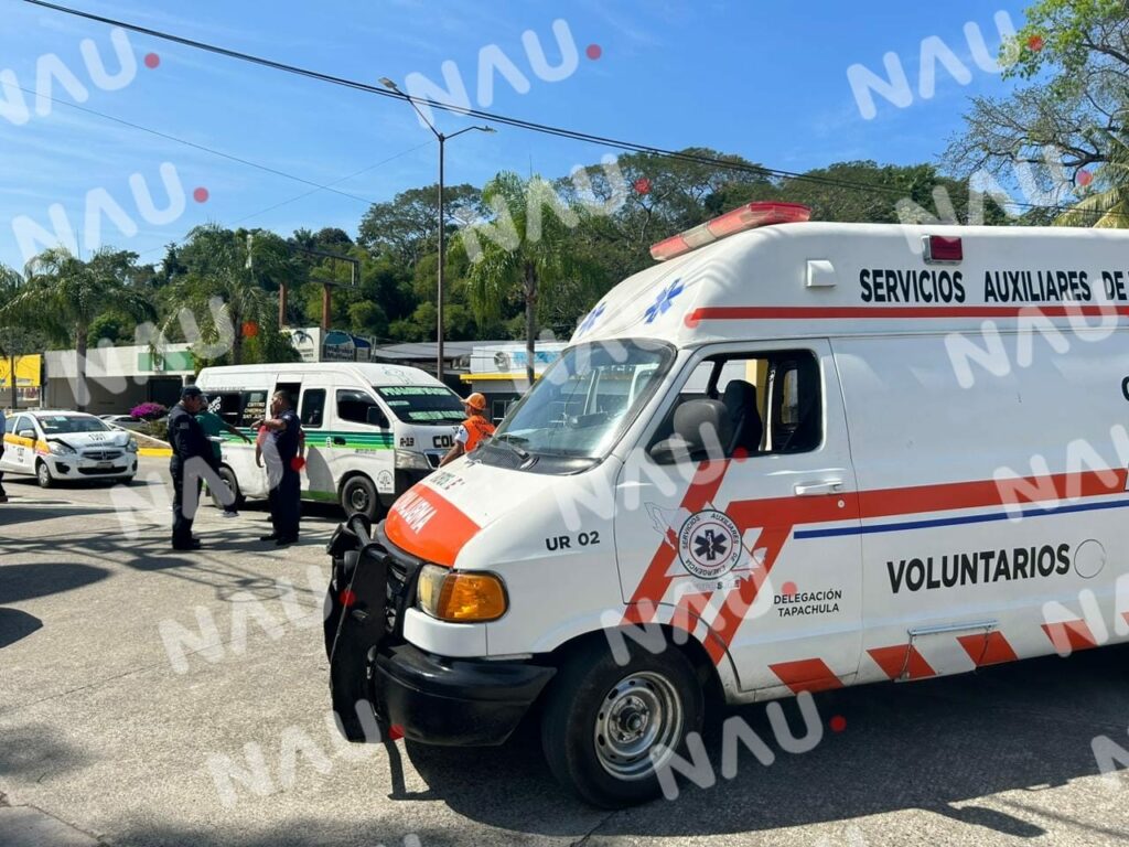 Tapachula, Chiapas. Dos personas con crisis nerviosa y daños materiales dejó un accidente entre un taxi y una combi de pasaje.