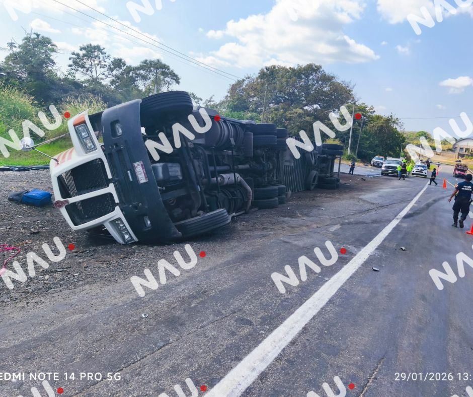 De acuerdo con información recabada en el lugar, el percance no dejó personas lesionadas, aunque la unidad pesada resultó con severos daños materiales tras quedar recostada sobre la cinta asfáltica, lo que generó alarma entre automovilistas que circulaban por la zona.