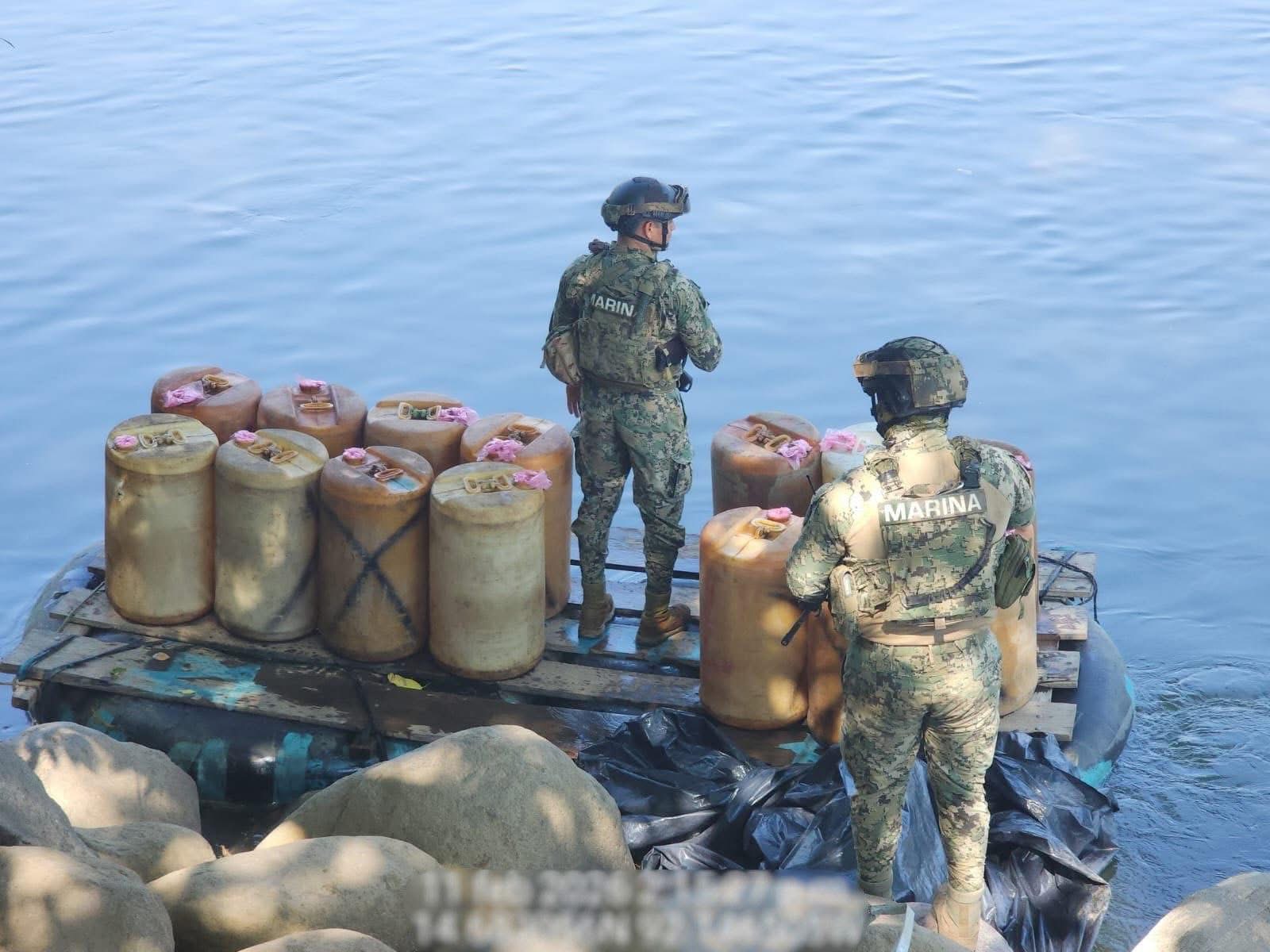 El hallazgo se realizó durante patrullajes de vigilancia terrestre efectuados por personal naval, quienes detectaron varios recipientes abandonados sobre una balsa en el río Suchiate. Tras llevar a cabo la inspección correspondiente, se confirmó que se trataba de 15 bidones de plástico con capacidad aproximada de 76 litros cada uno, los cuales contenían una sustancia traslúcida con características similares al diésel.