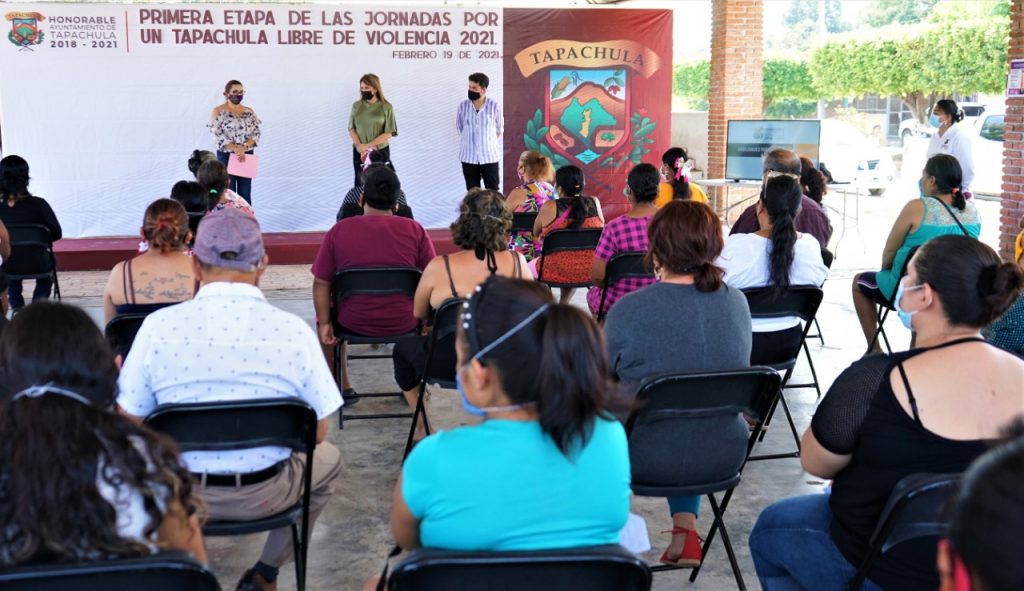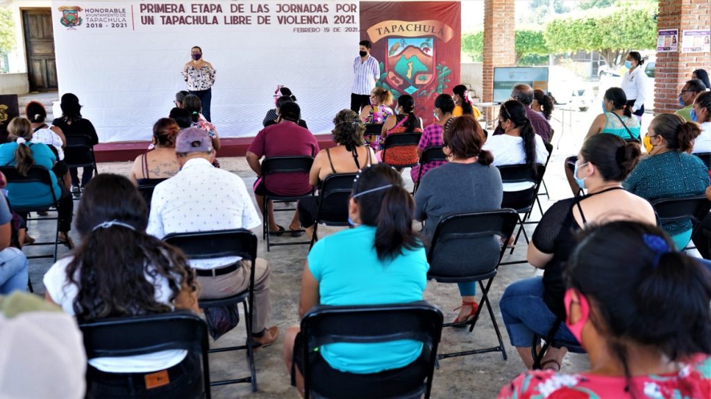 Tapachula, Chiapas.- Con el objetivo de sensibilizar a la población sobre los problemas generados por la violencia hacia las mujeres y las niñas, el Ayuntamiento de Tapachula inició la primera etapa de las jornadas “Por un Tapachula Libre de Violencia 2021”, en el ejido Álvaro Obregón.