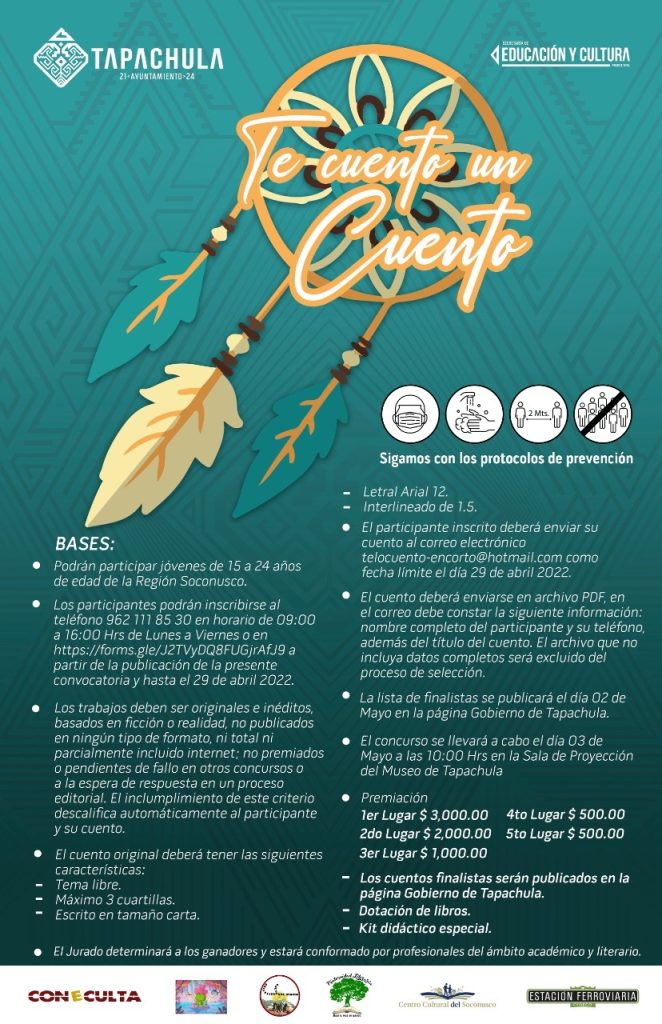 Tapachula, Chiapas.- El Ayuntamiento Municipal a través de la Secretaría de Educación y Cultura invita a los jóvenes de 15 a 24 años a participar en el concurso literario “Te Cuento un Cuento”, a realizarse el próximo 03 de mayo en la Sala de Proyecciones del Museo de Tapachula (MUTAP).